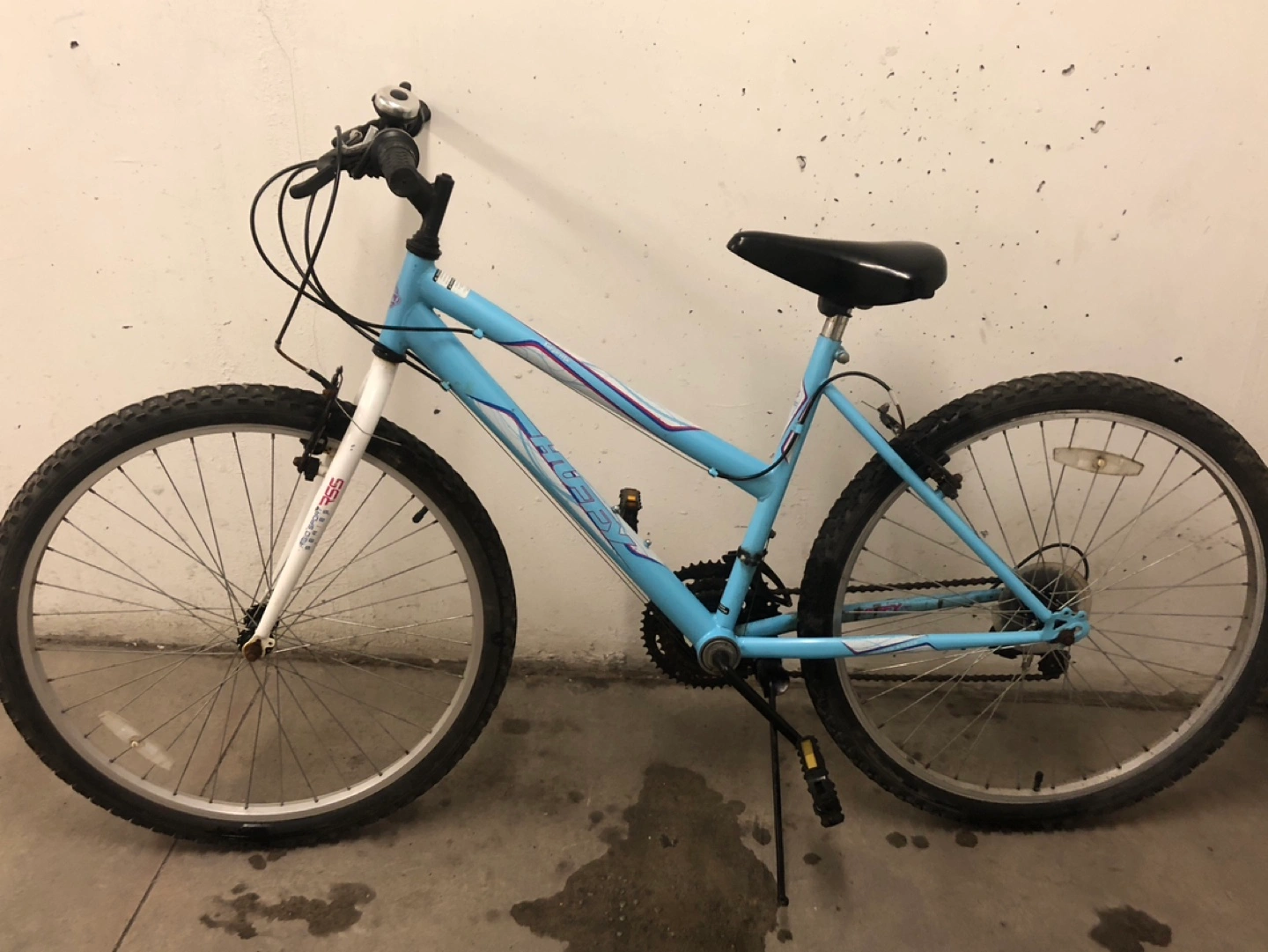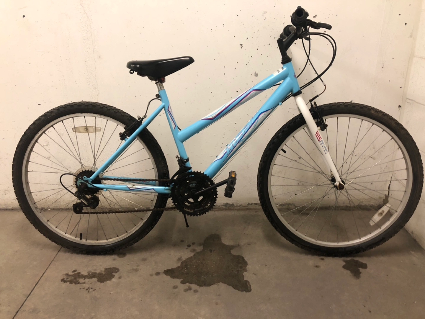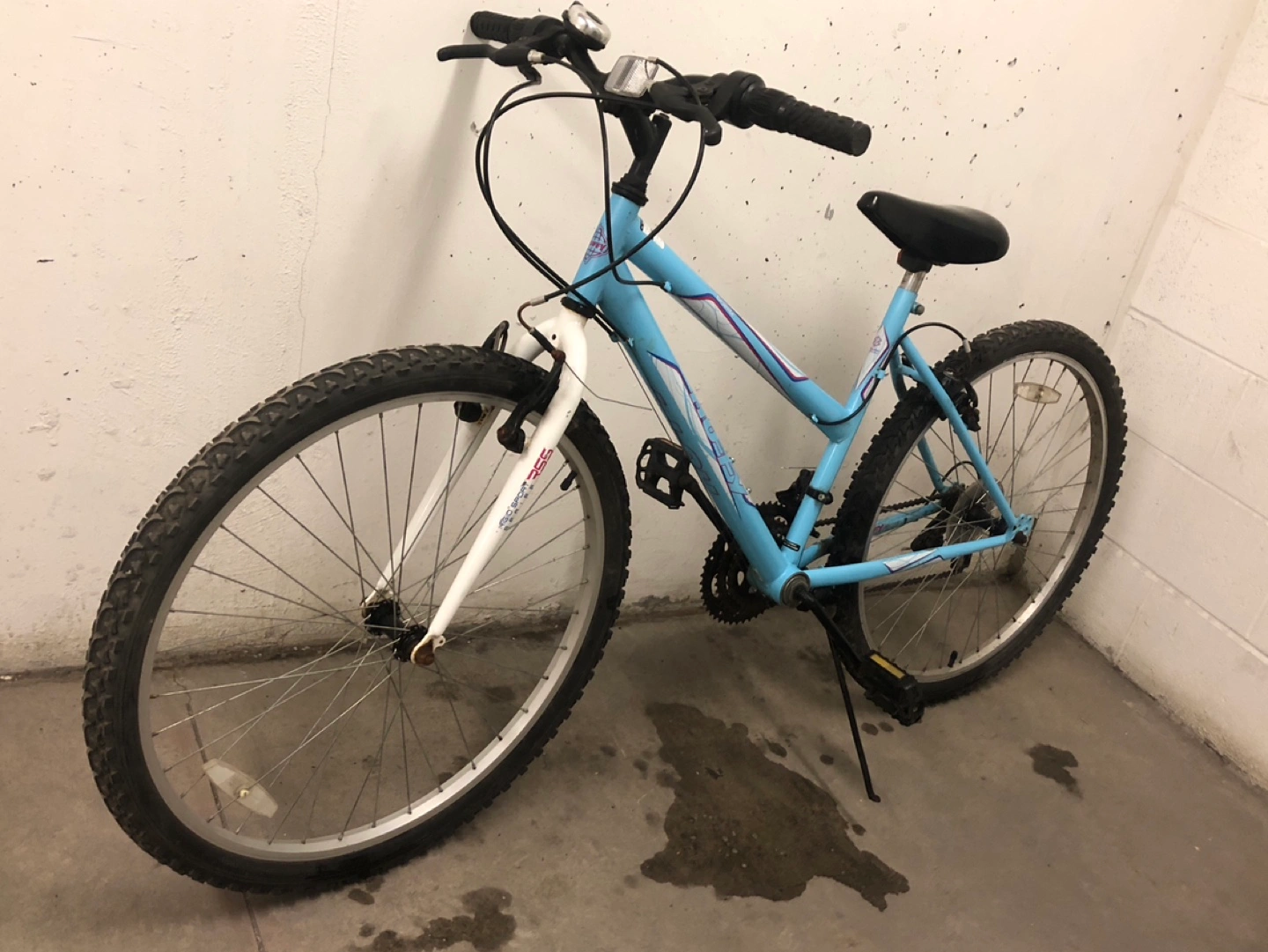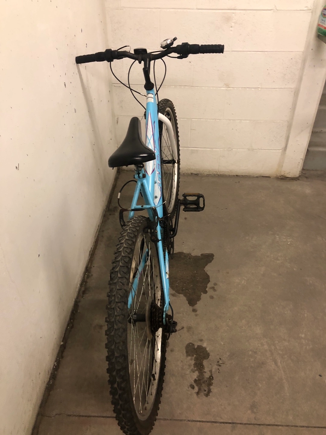 122Lightly used mountain bike. Light blue and white colour scheme. Needs some TLC. Good for shorter commutes or leisure rides.