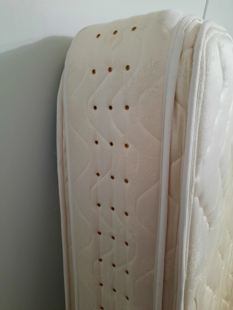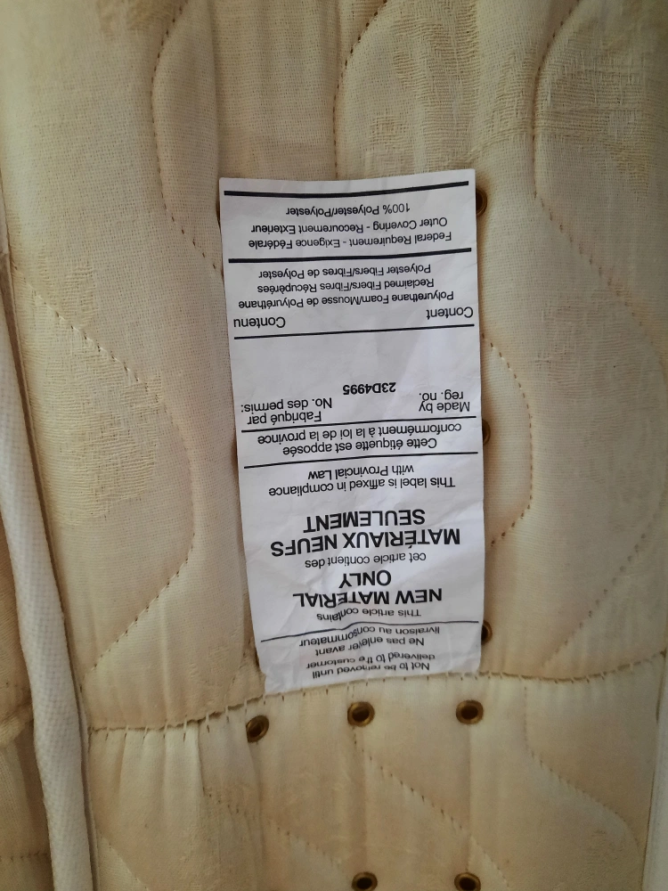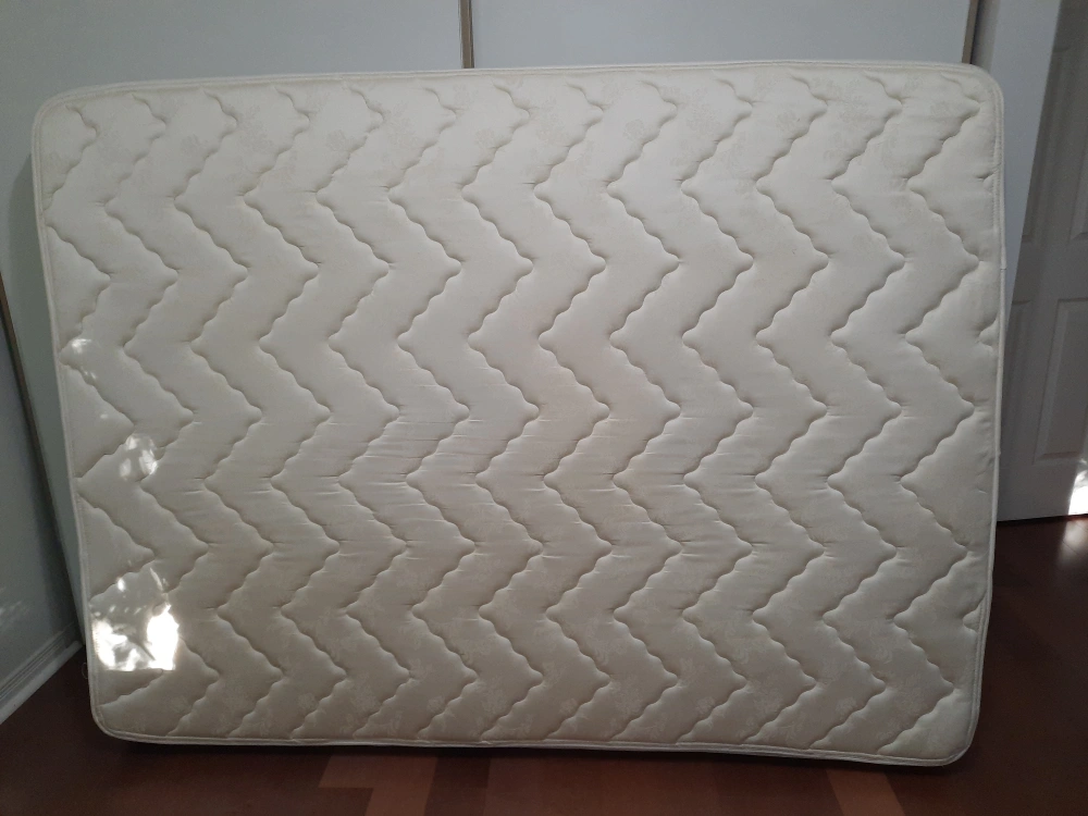 Selling a used mattress that's still in good shape! It has a 100% polyester outer covering and is filled with polyurethane foam and reclaimed fibres