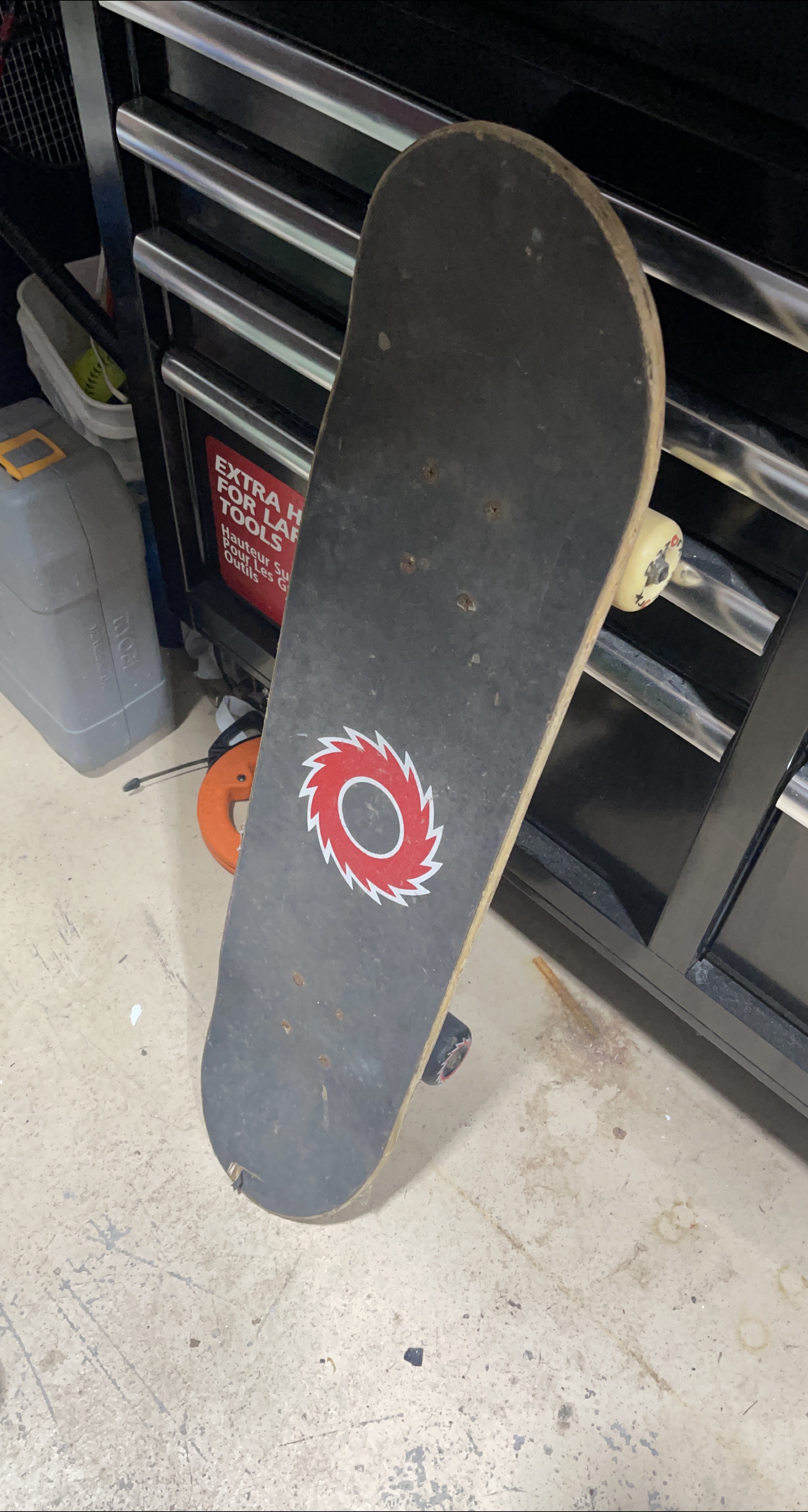Selling a used skateboard. It's black with a red and white circular logo. Shows signs of wear and tear but still functional. Great for beginners!