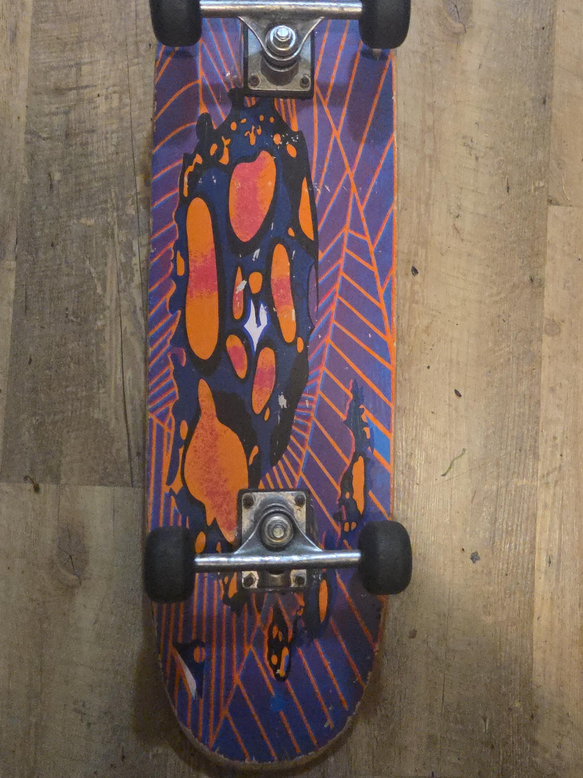 76Selling a used skateboard with a cool purple and orange design! It's got some wear and tear, but still rides well. Perfect for someone looking to cruise around town or practice some tricks open to offers