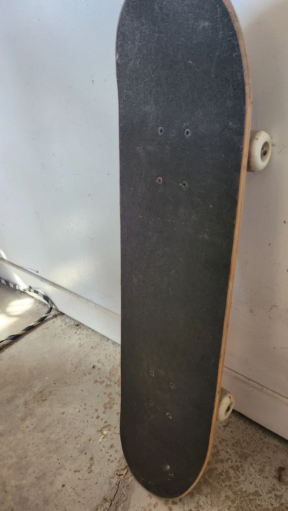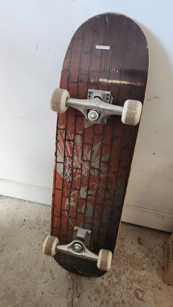 Selling a used skateboard. It has a brick-like design on the bottom and a black grip tape on top. The wheels show signs of use, but it's still ready to ride!