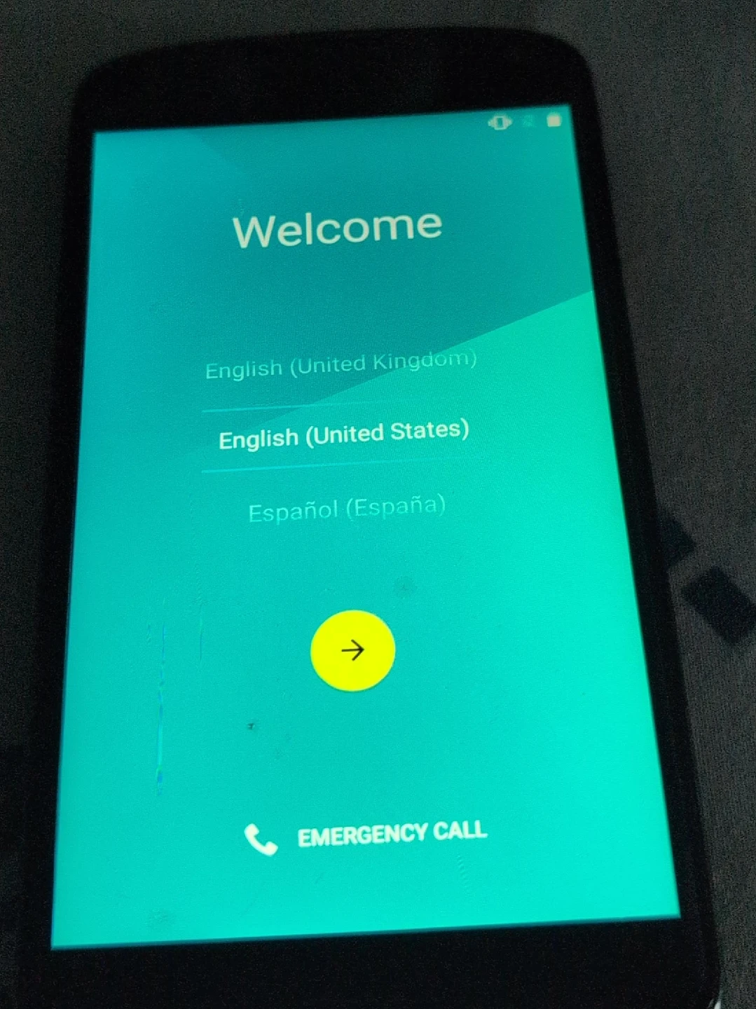 113Selling a used smartphone. The screen displays a welcome message with language options including English (United Kingdom), English (United States), and Español (España). There's also an emergency call option. It shows some signs of use.
