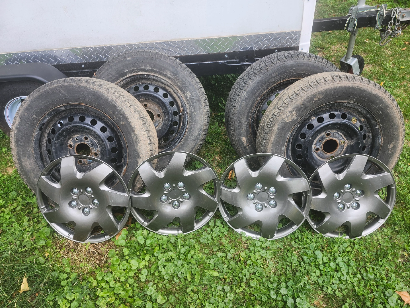 Selling a set of four used win pick uo in Miltonnter tires,winter rims with hubcaps. They show signs of wear, but still have some life left in them. Perfect for someone needing a budget-friendly set! taken off a nissan sentra 2010 195/65R15 4 stud