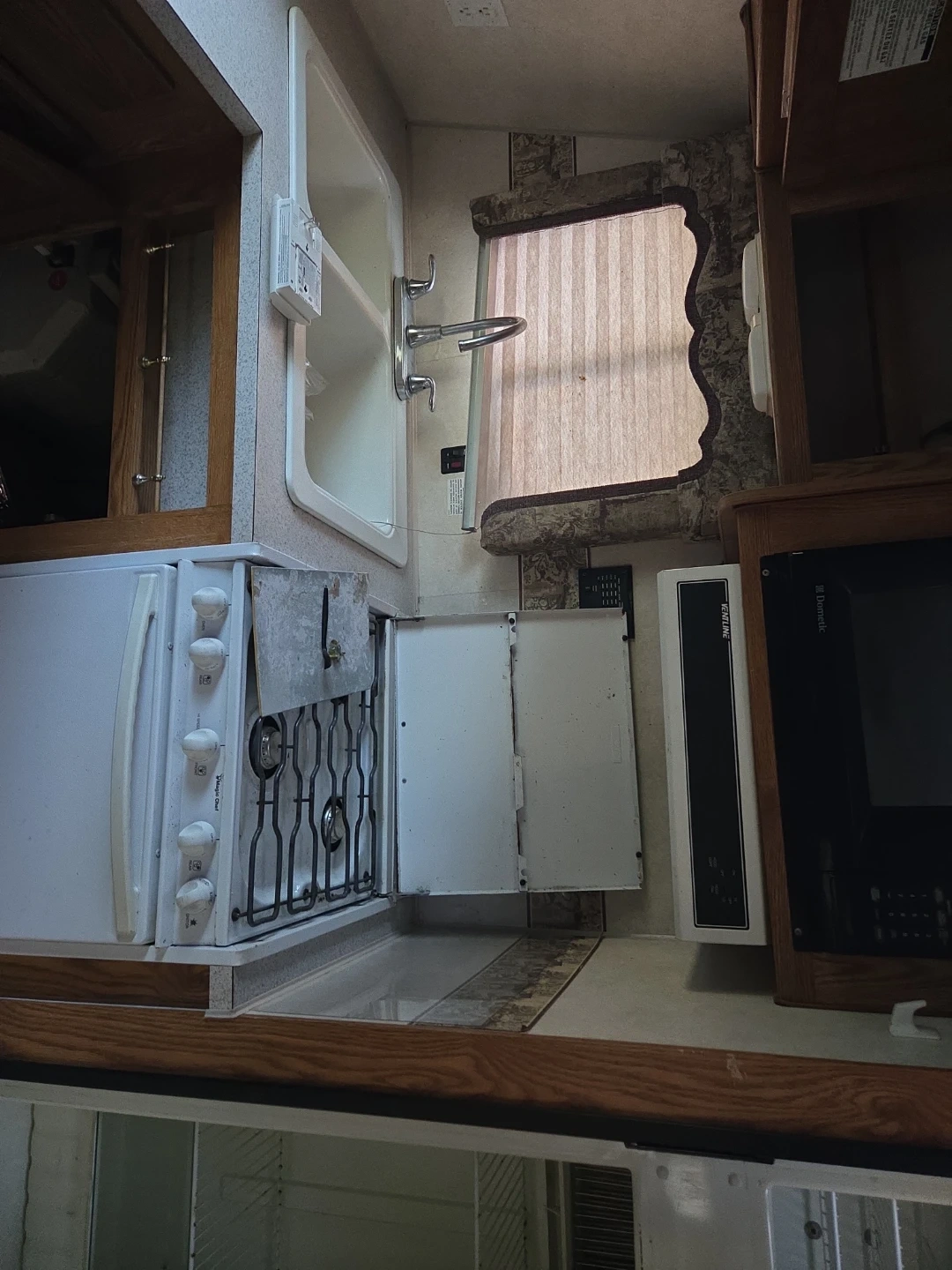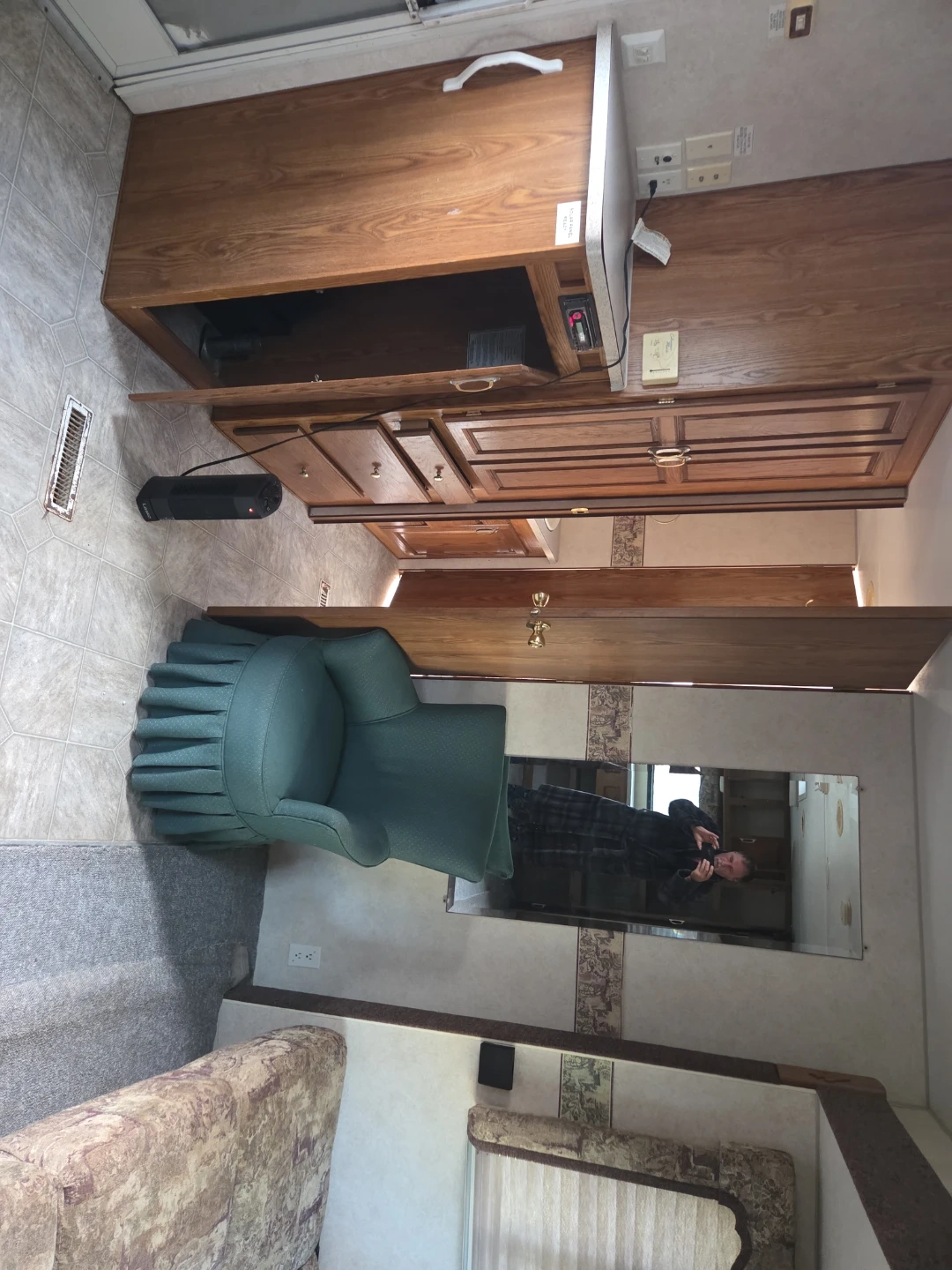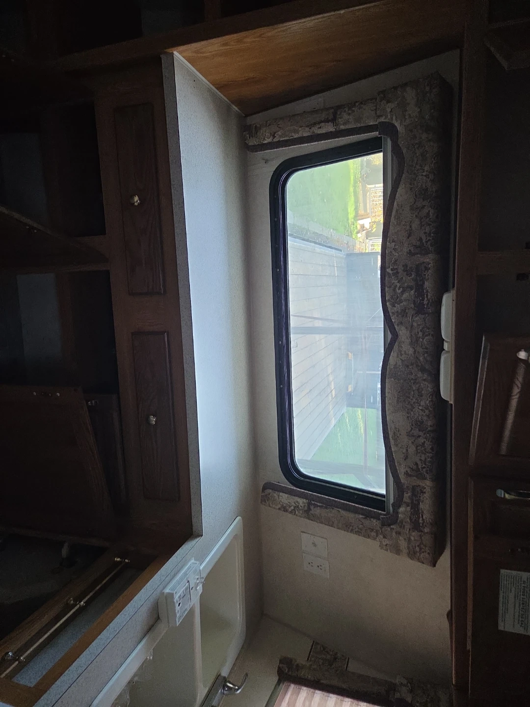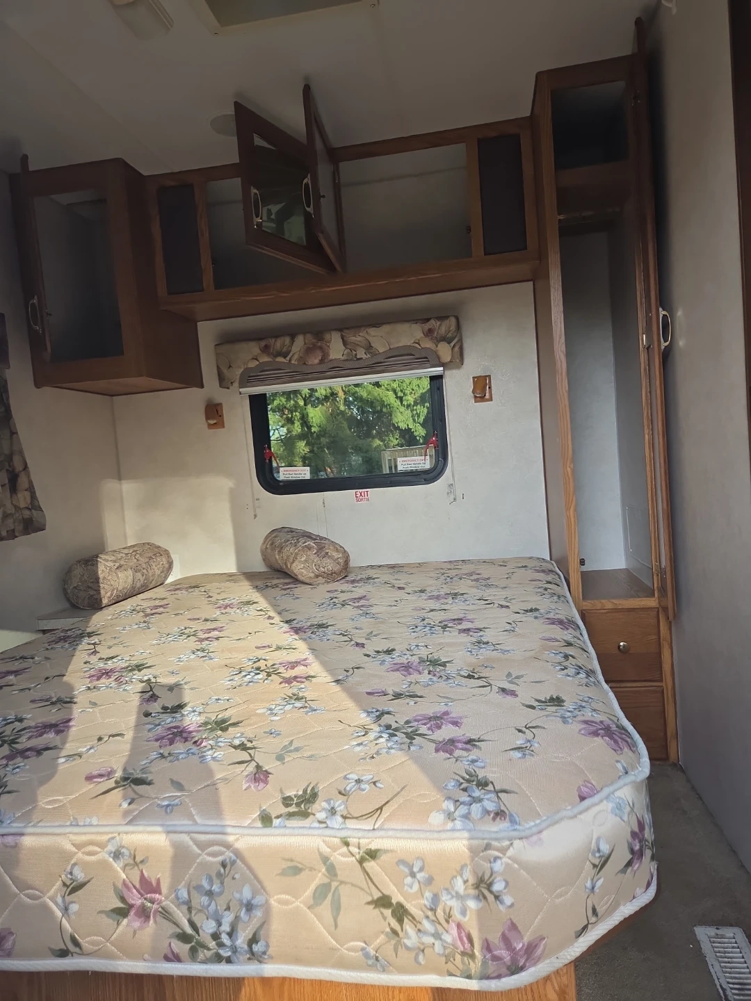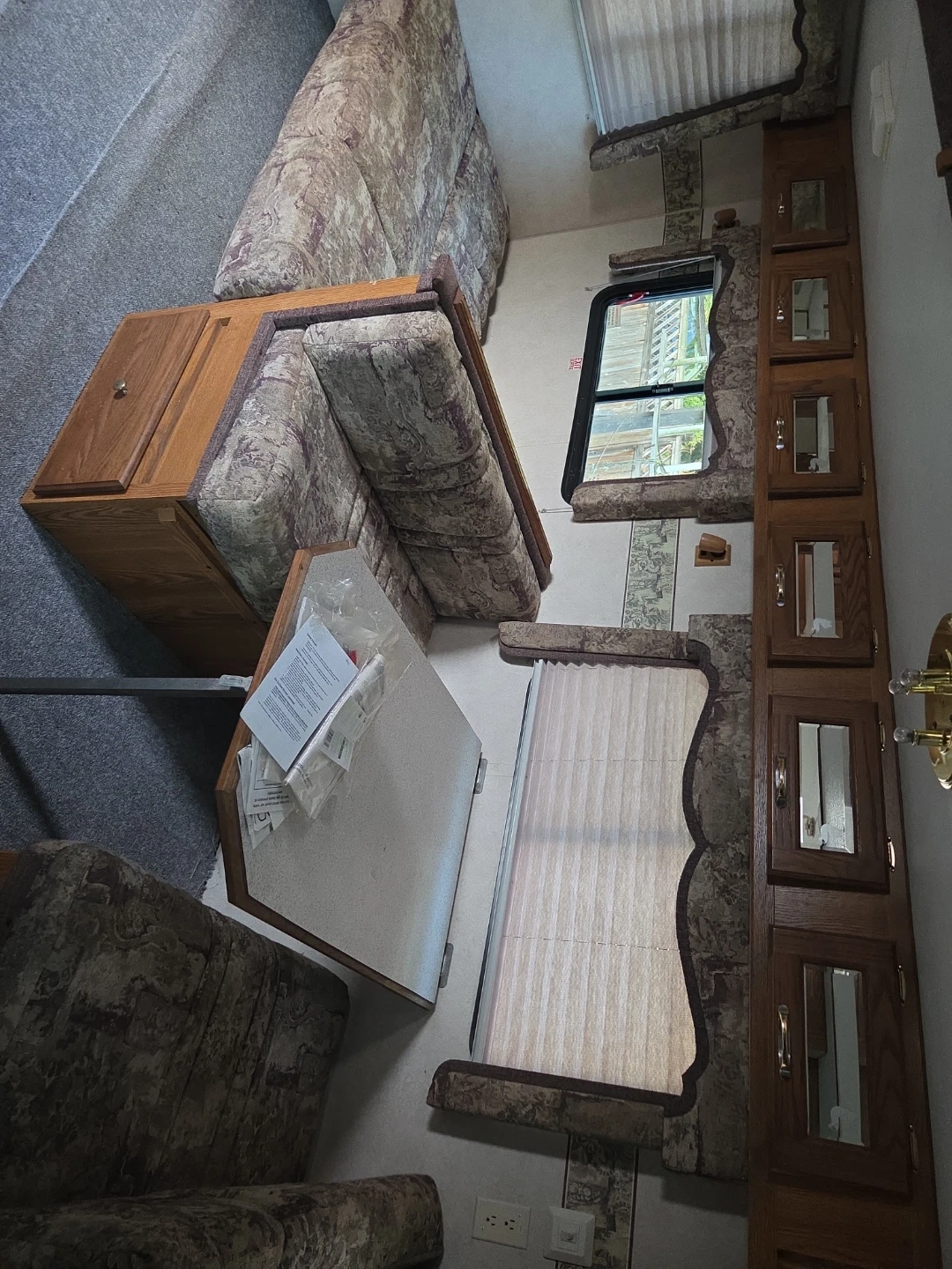 10Selling a used travel trailer. It has a cozy interior with wood cabinetry and patterned upholstery. The trailer includes a kitchen area with a sink and storage, a seating area, and a window for natural light. Great for camping trips!