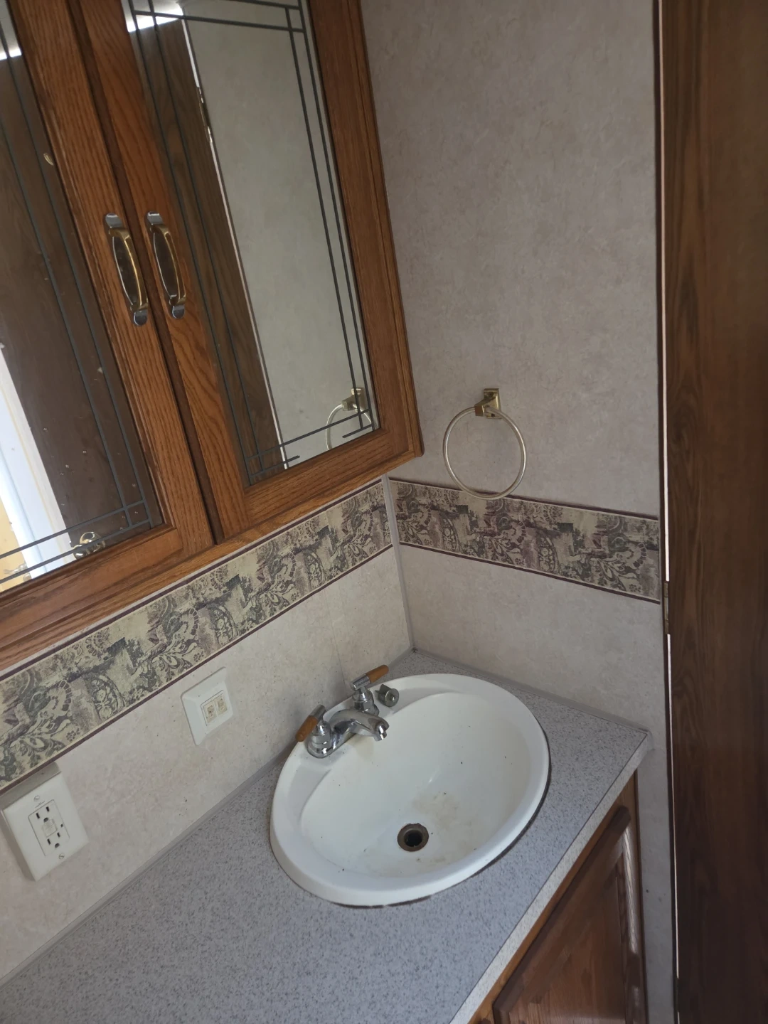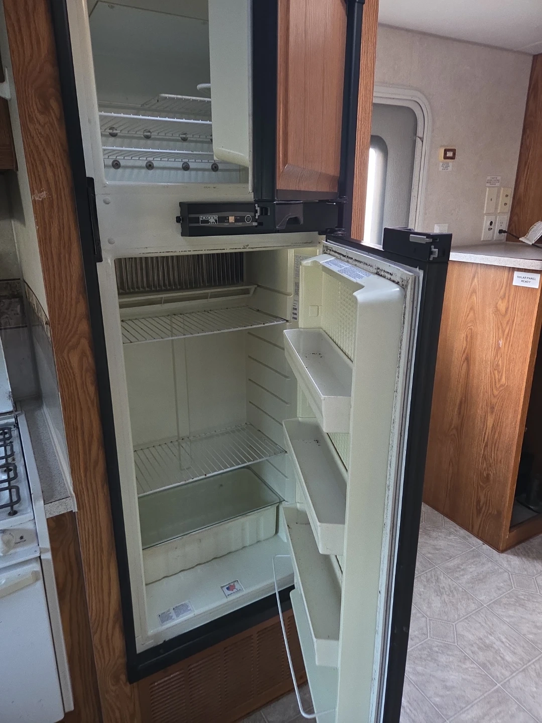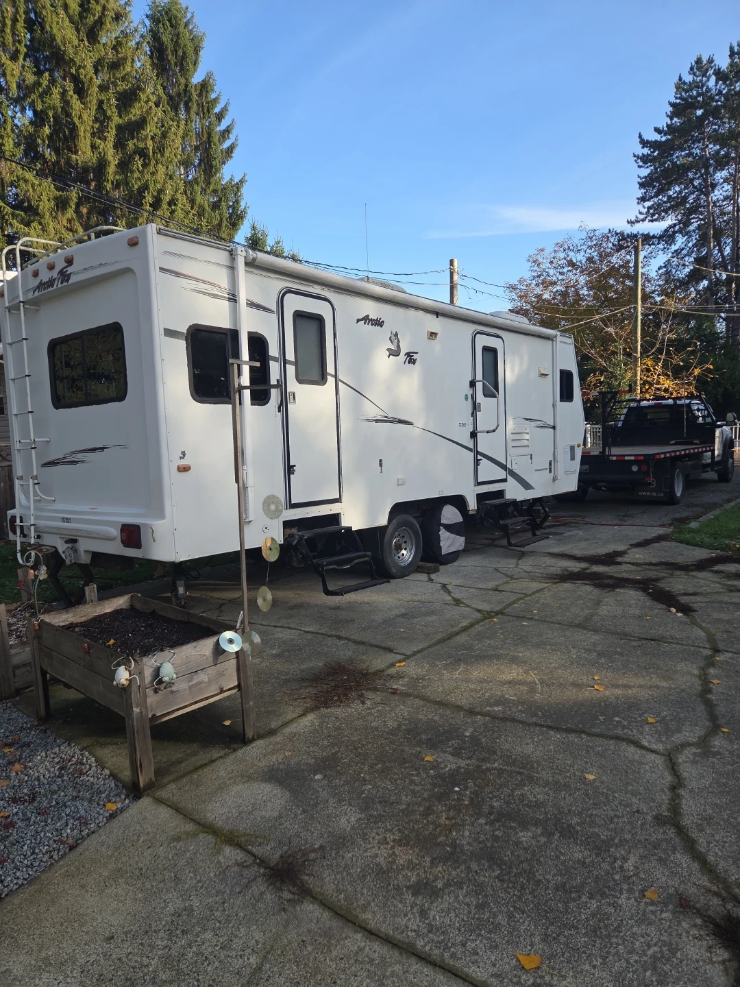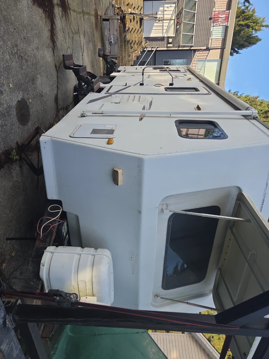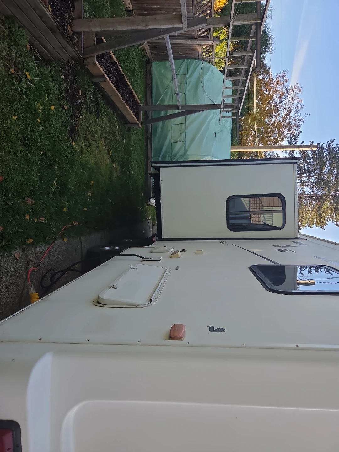 10Selling a used travel trailer. It has a cozy interior with wood cabinetry and patterned upholstery. The trailer includes a kitchen area with a sink and storage, a seating area, and a window for natural light. Great for camping trips!