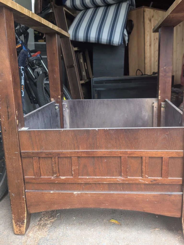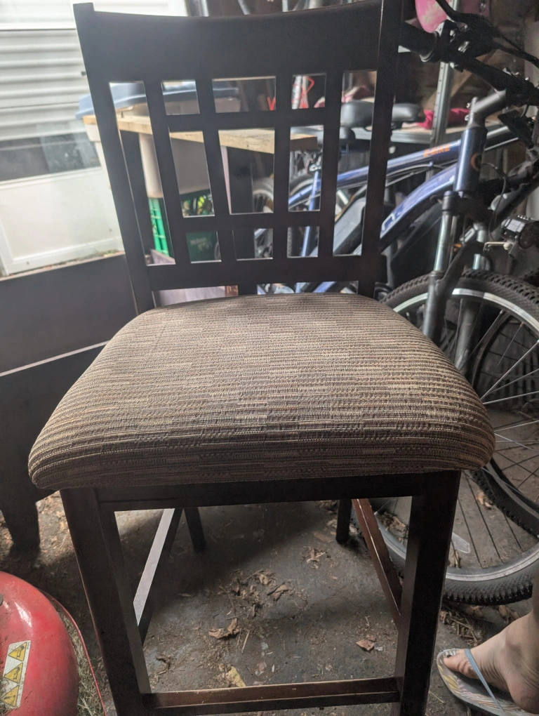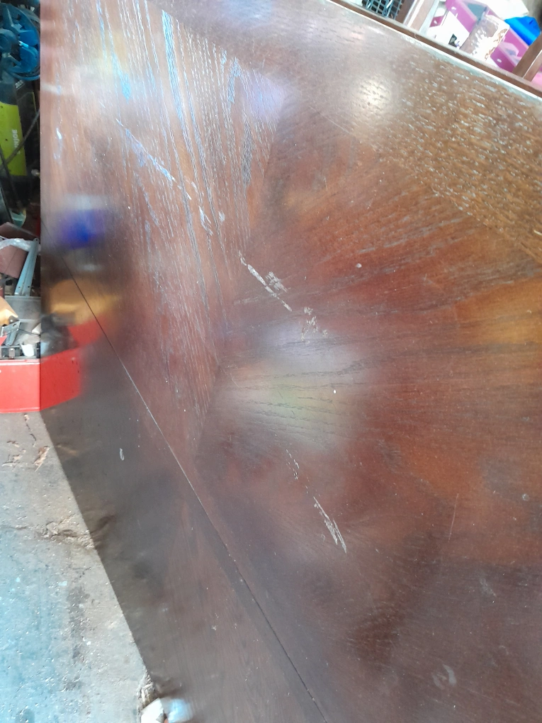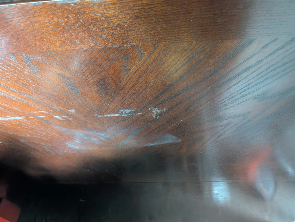 Selling a used wooden dining table and chair set. The table has some wear and tear on the surface, and the chairs have some scratches as well. Please see photos for details. built in table and set of 6 chairs