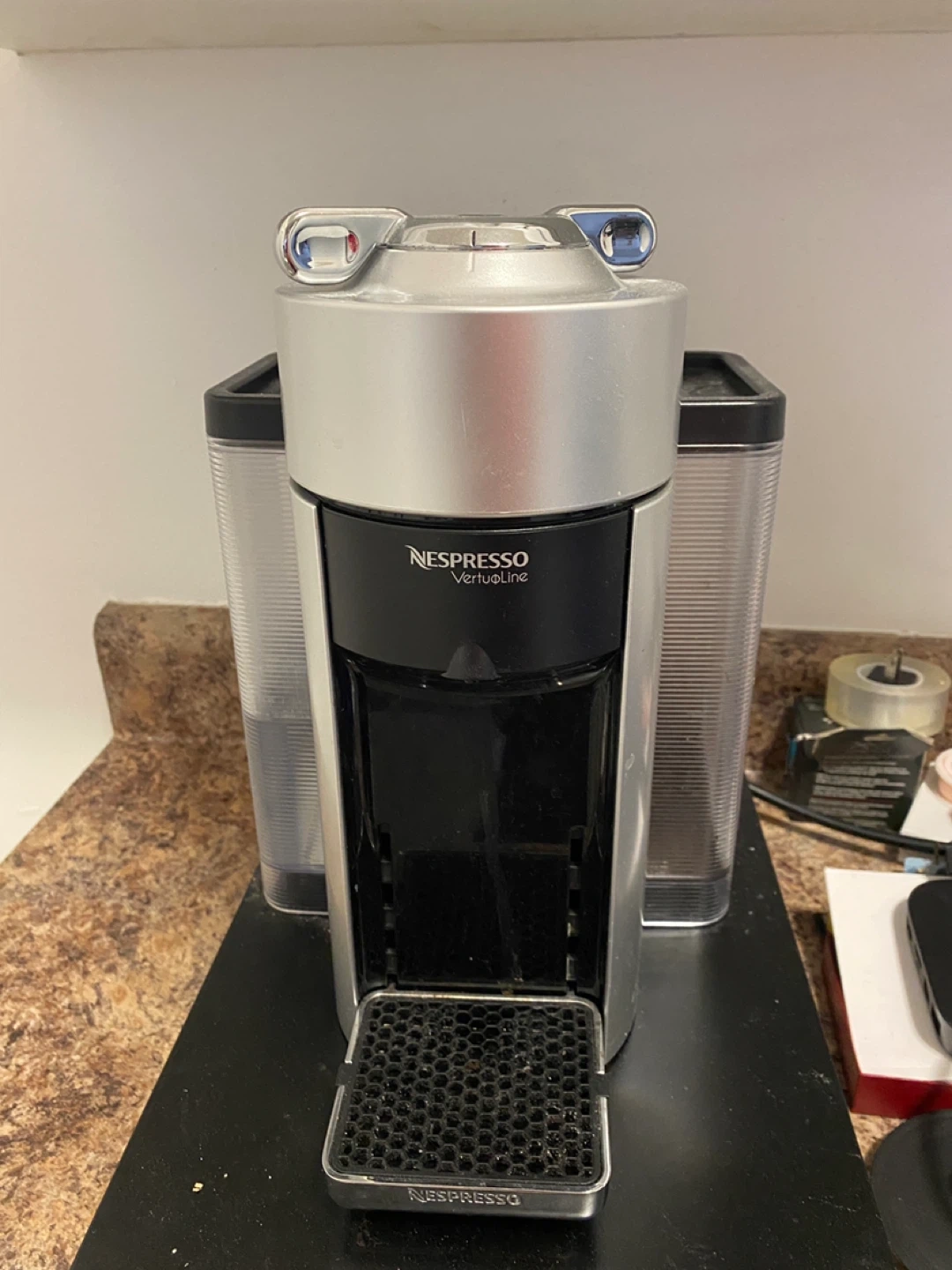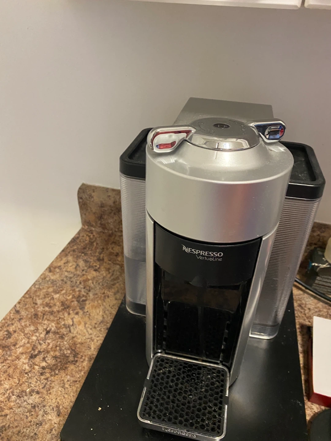 This is a Nespresso VertuoLine coffee machine. It's a sleek silver and black unit designed for making single-serve coffee and espresso.