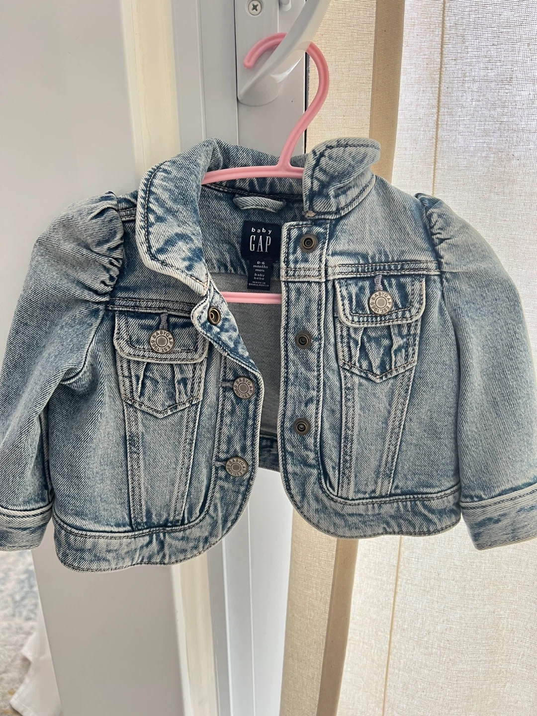 This is a cute light wash denim jacket from Baby Gap. It's sized for 0-6 months. Features button closures and chest pockets. Perfect for a little one's wardrobe!