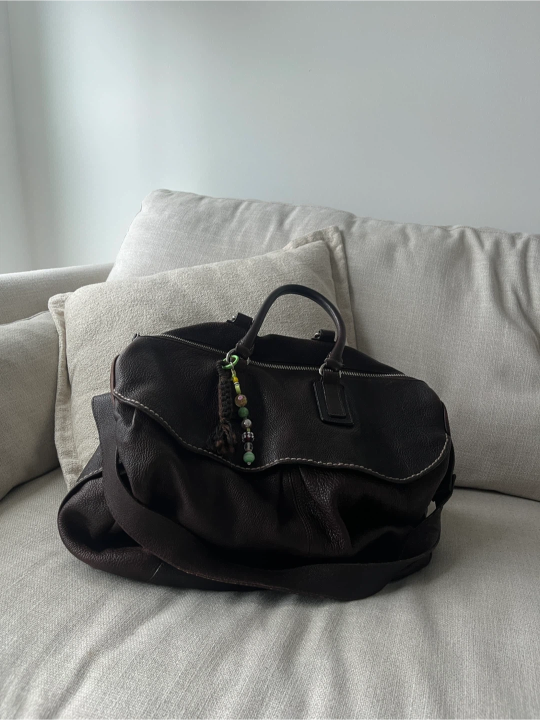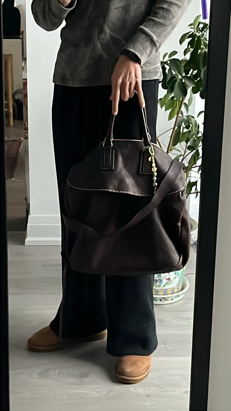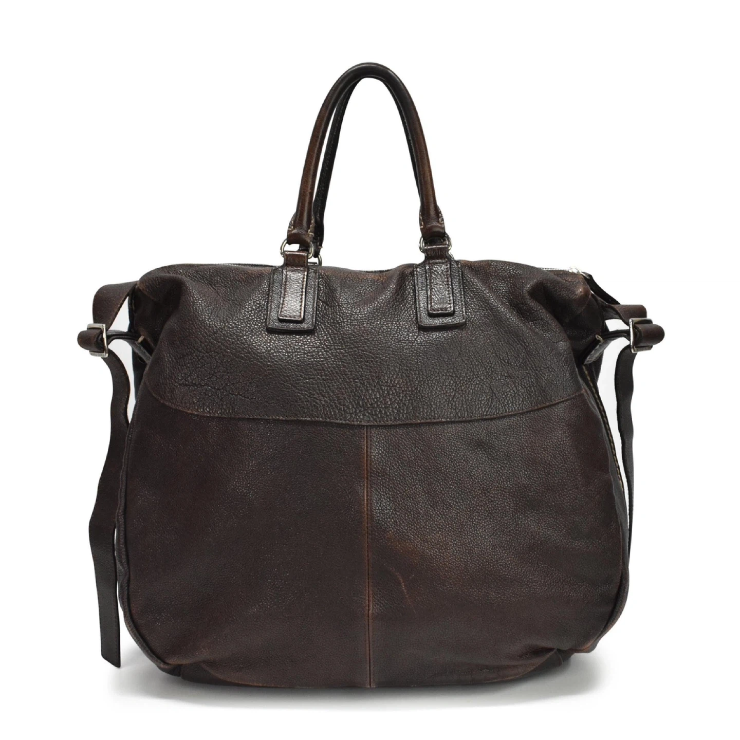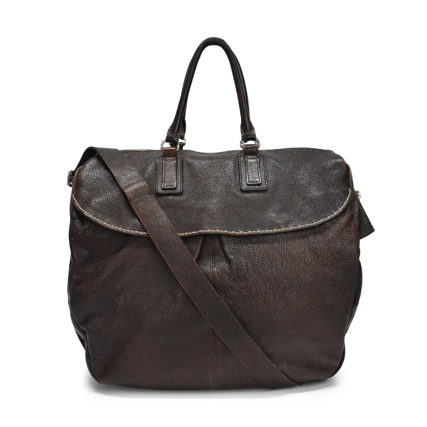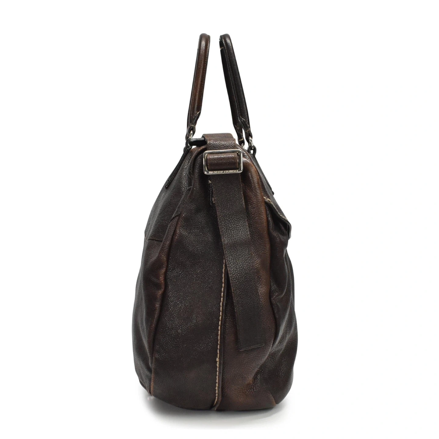 Brunello Cucinelli oversized tote bag in brown grained leather with beige contrast stitching and rolled top handles. Features a front flap with two open pockets, an adjustable shoulder strap, and an inner zip pocket.