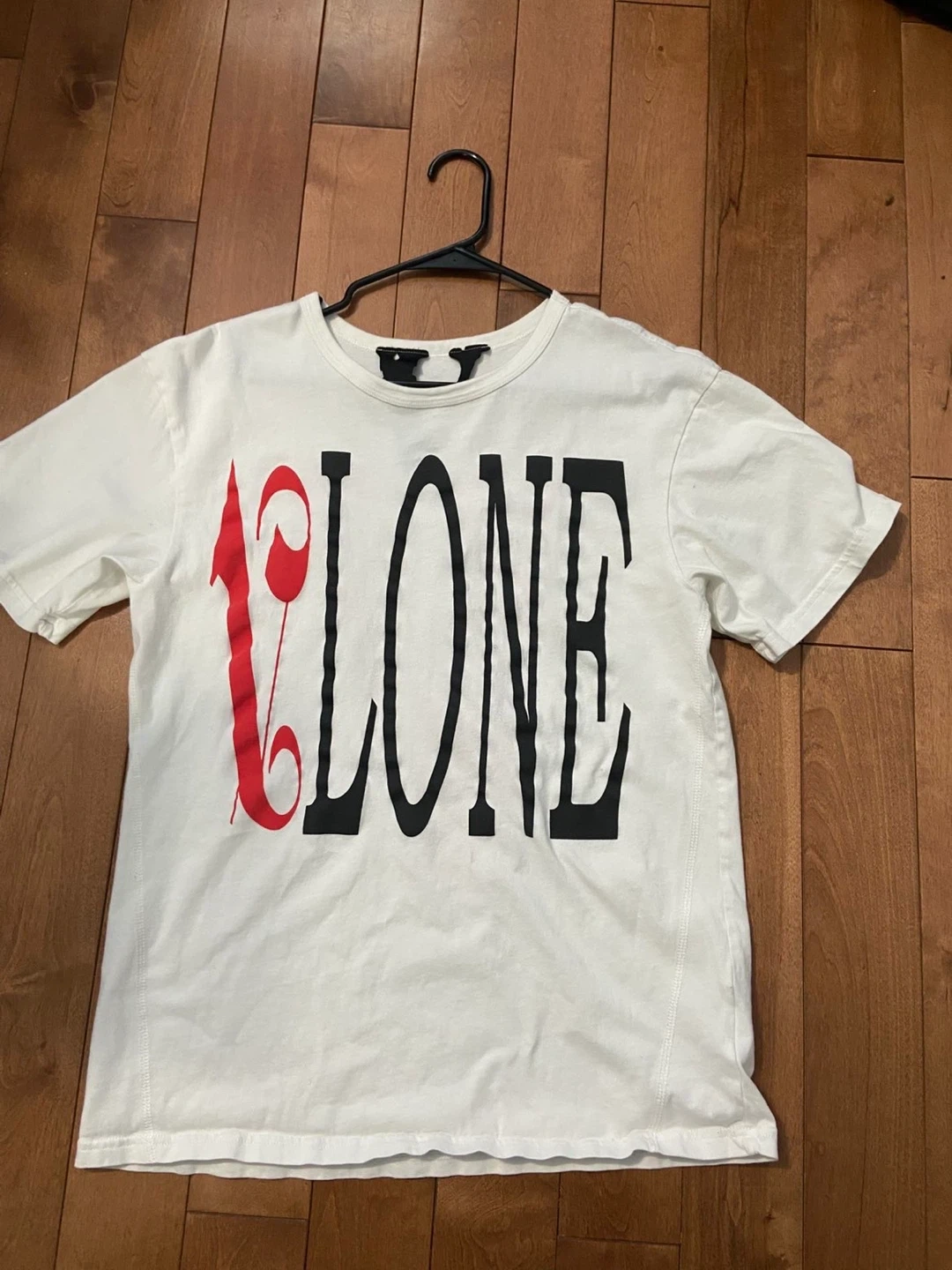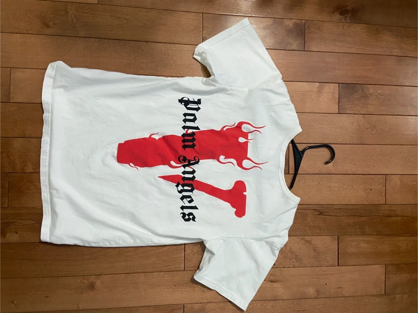 This is a white Vlone t-shirt with a red Palm Angels graphic print. It's made of 100% cotton and manufactured in the USA. The size is medium.