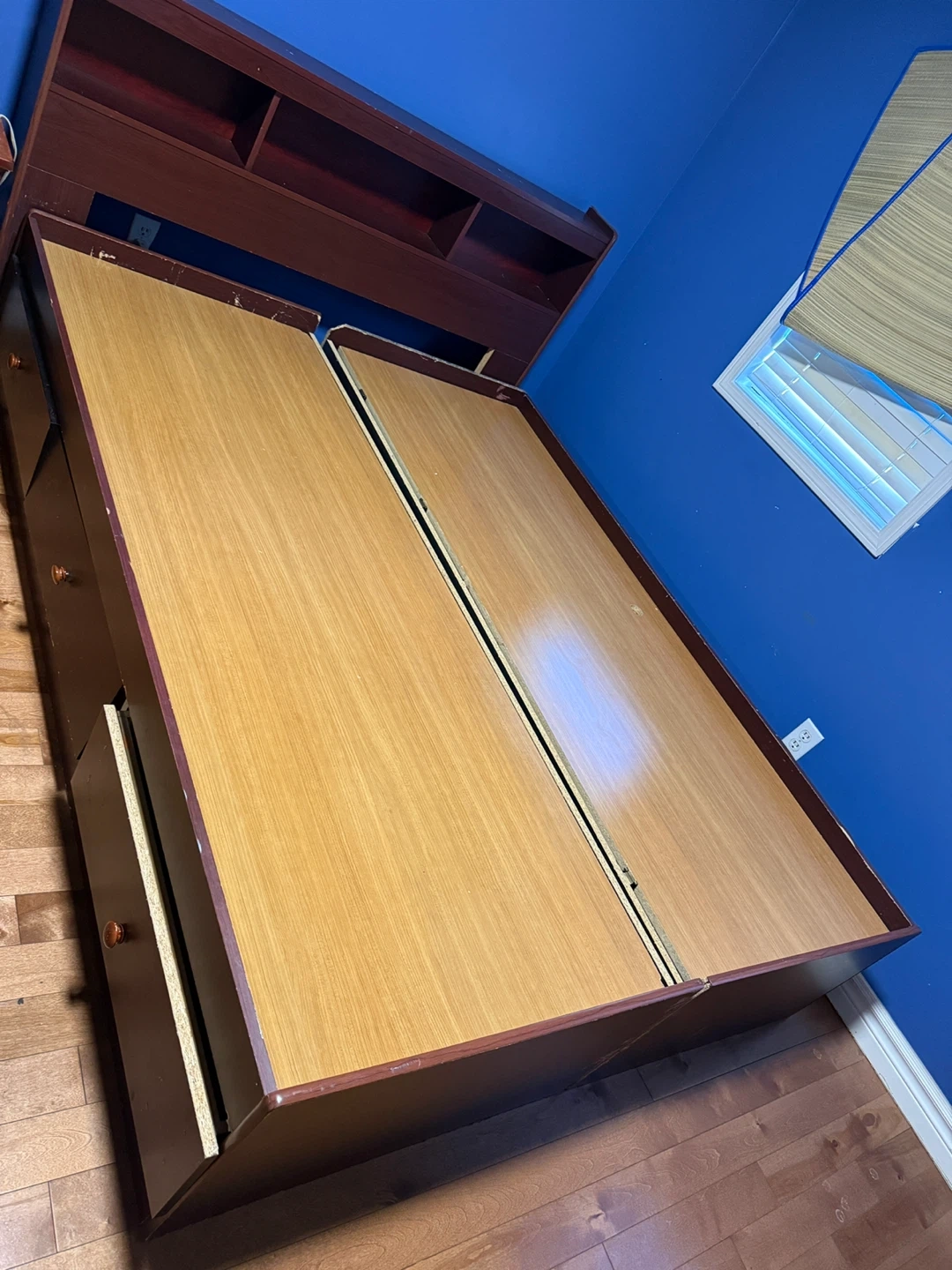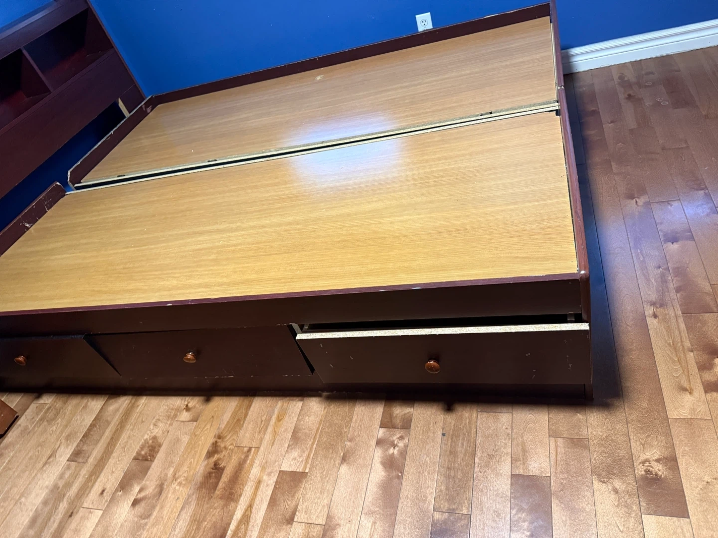 A twin captain's bed frame with a built-in headboard featuring shelves. It's made of wood composite in a dark cherry and light wood finish. Includes multiple storage drawers built into the base. This bed's design offers practical storage solutions for any bedroom.
