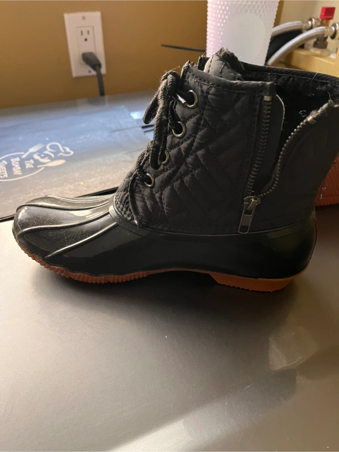 Cute black duck boots! They have a quilted design on the upper part of the boot and a lace-up front. The sole is a contrasting orange colour