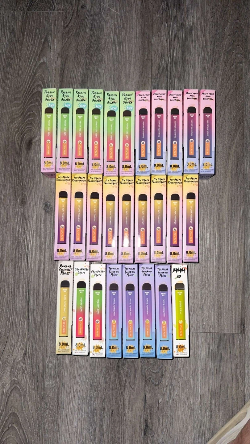 This is a lot of OVNS pens. They each contain 8.0mL of e-liquid. Available flavours include Passion Kiwi Guava, Peach Fruit Pink Raspberry, Icy Grape Passionfruit, Banana Coconut Frost, Cranberry Grape, and Tropical Rainbow Frost.