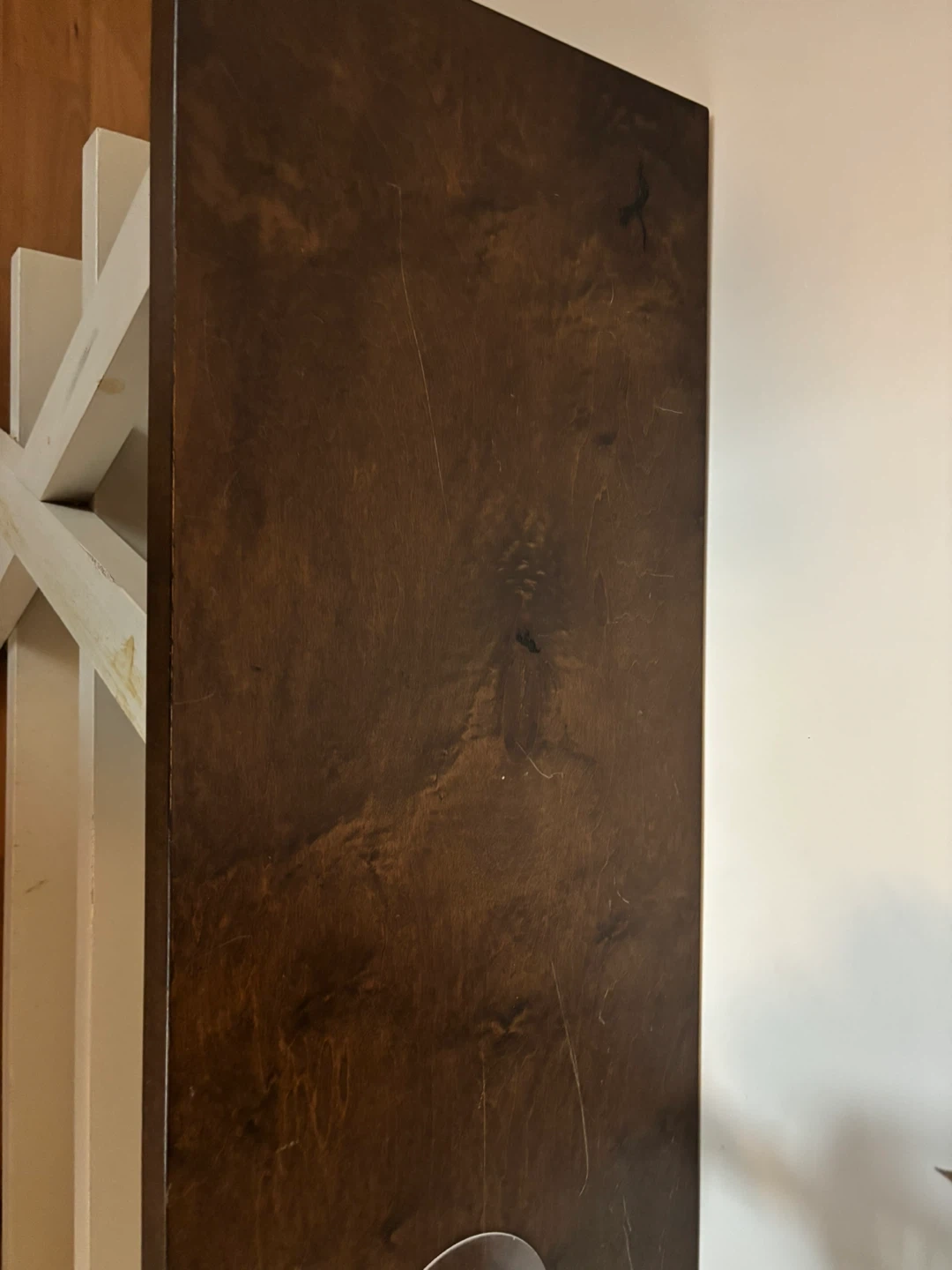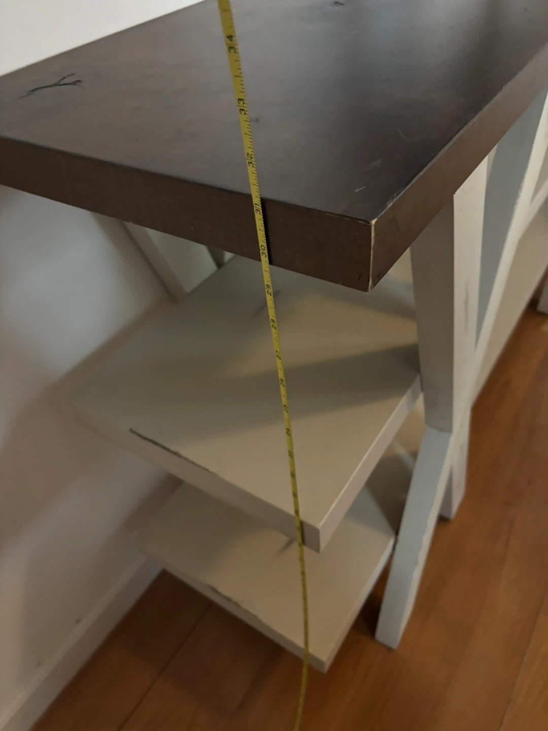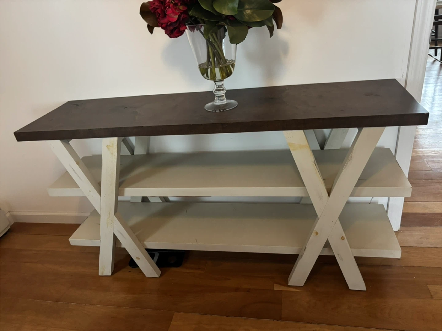 Console table with a dark wood top and white X-frame legs. It has three shelves for storage or display. Tabletop measures 60 inches long. Height is 31 inches, and width is 15.5 inches. Great for entryways or living rooms!