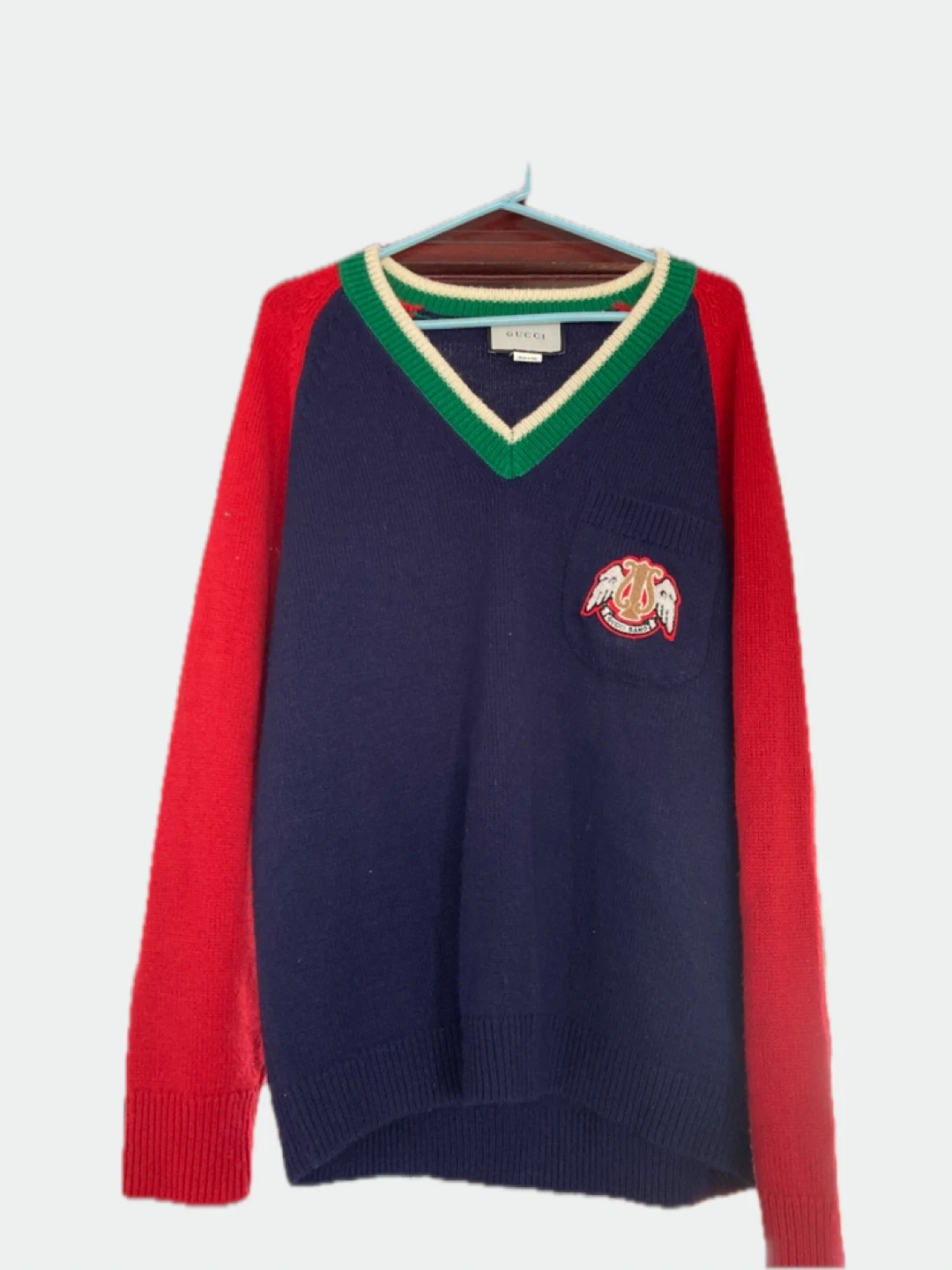 Gucci V-neck sweater. Features a navy body with red sleeves and a green and white striped collar. It has a small embroidered crest on the chest pocket.