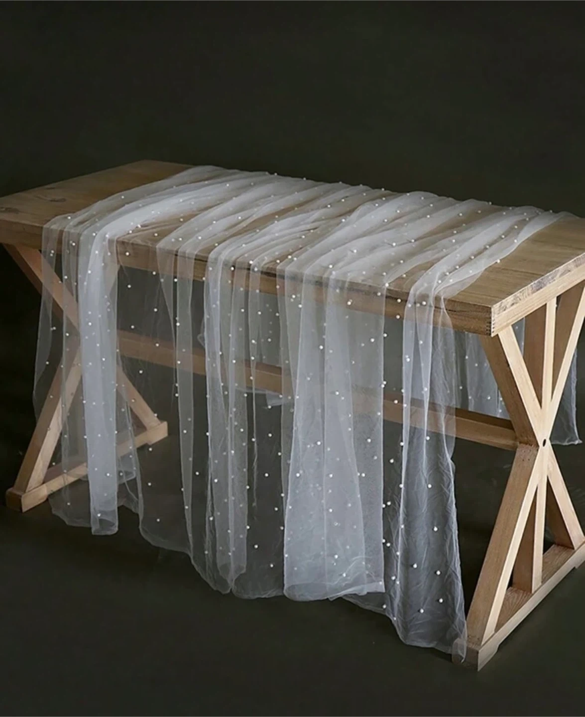 10 white tulle table runner, embellished with faux pearls. It measures 160cm (63 inches) long and 100cm (39 inches) wide. This runner adds a decorative touch to a table.