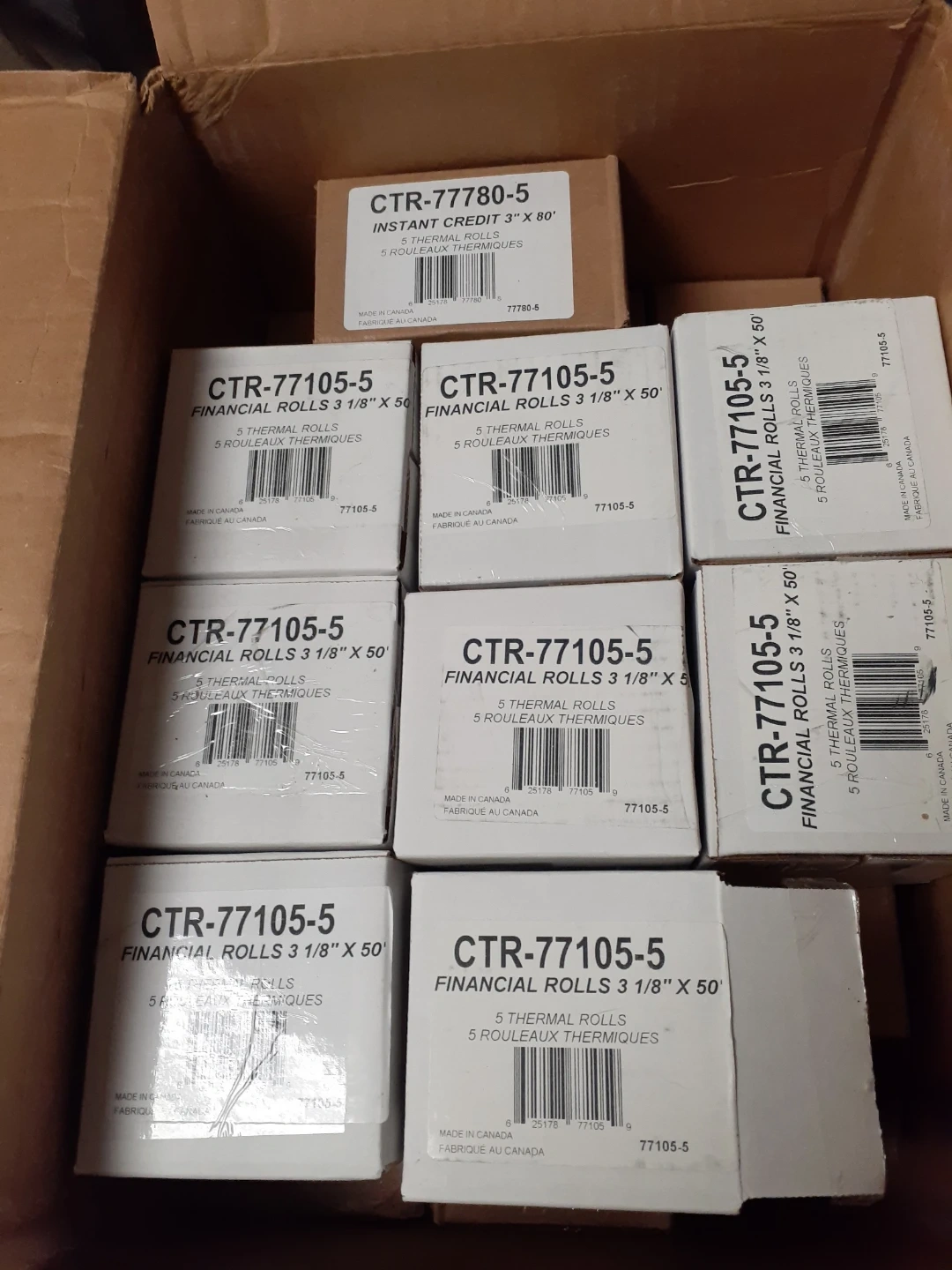 Bulk pack of Instant Credit CTR-77105-5 financial thermal rolls. Each box contains 5 rolls, measuring 3 1/8" x 50'. Made in Canada. Great for point-of-sale systems and receipts!