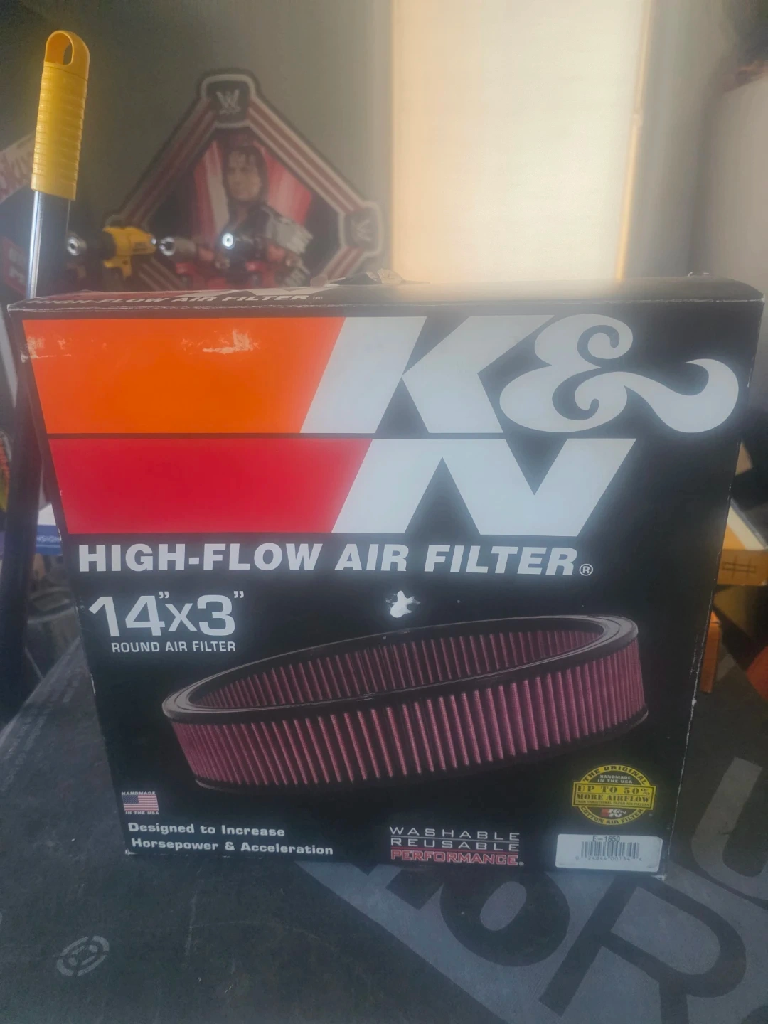 This K&N high-flow air filter is 14 by 3 inches and round. It's designed to increase horsepower and acceleration. It's washable and reusable for performance.