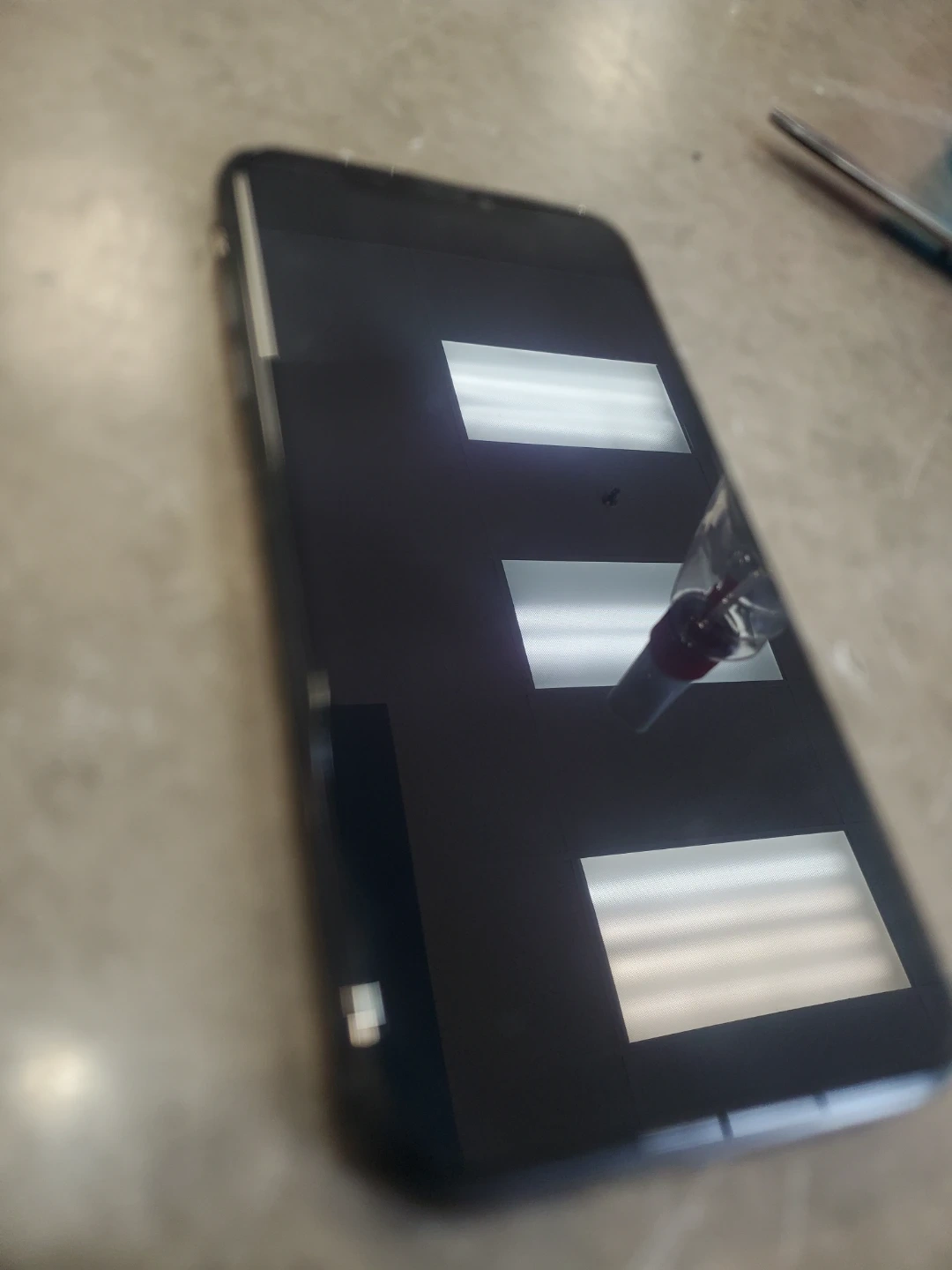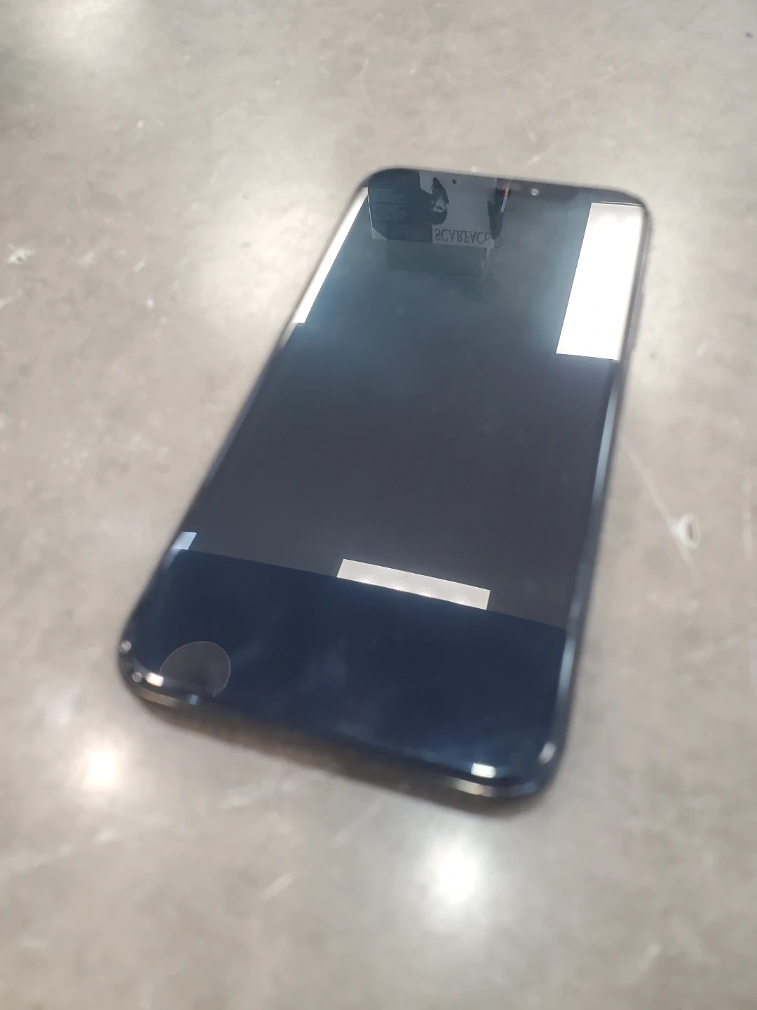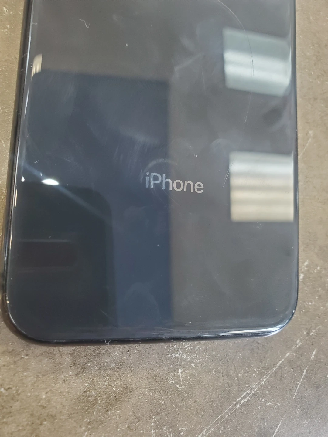 This is an Apple iPhone x. It's a used smartphone. It's a dark colour, likely black or dark grey. It shows some signs of wear like minor scratches on the back. It has the iconic iPhone logo on the rear. This phone would be useful for anyone needing a reliable mobile device.