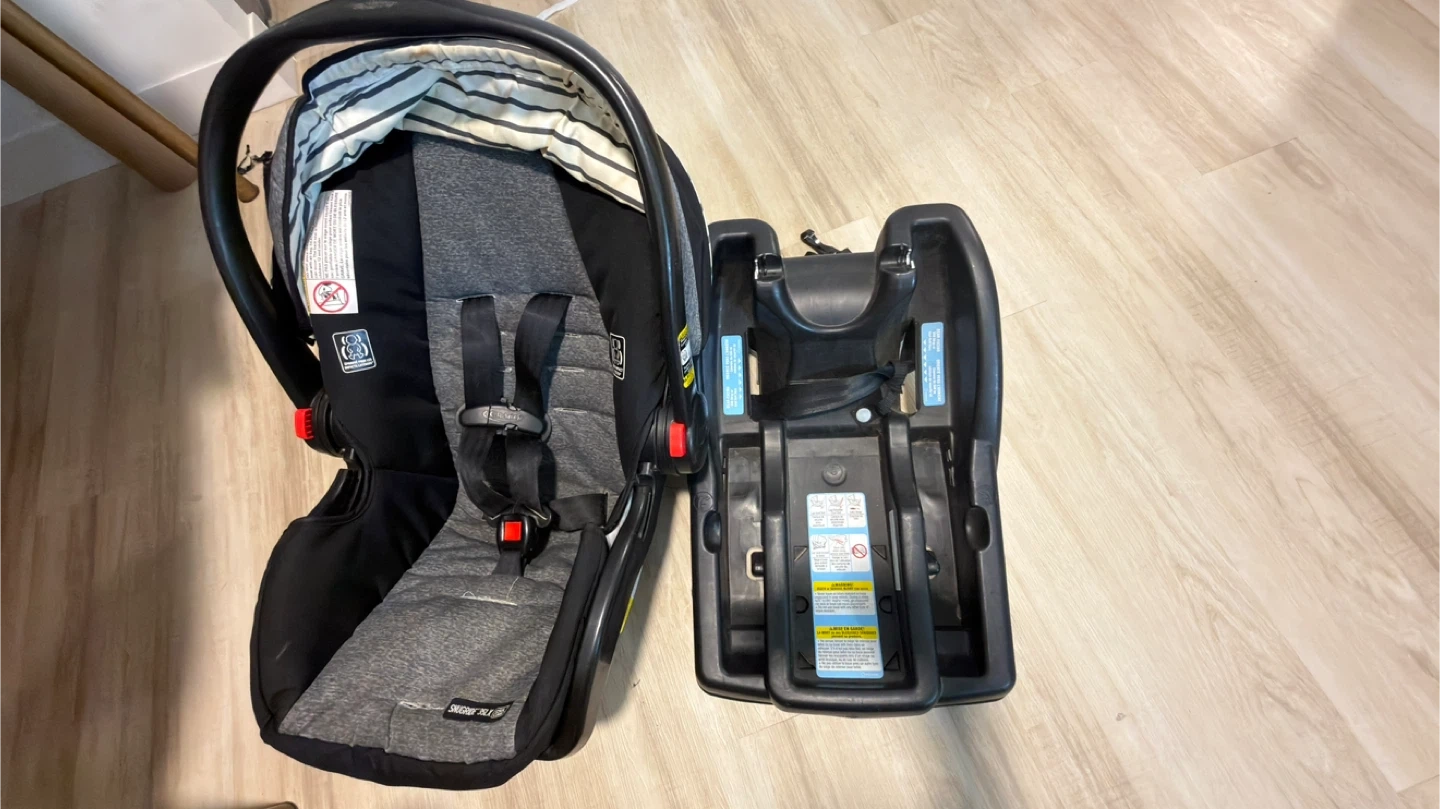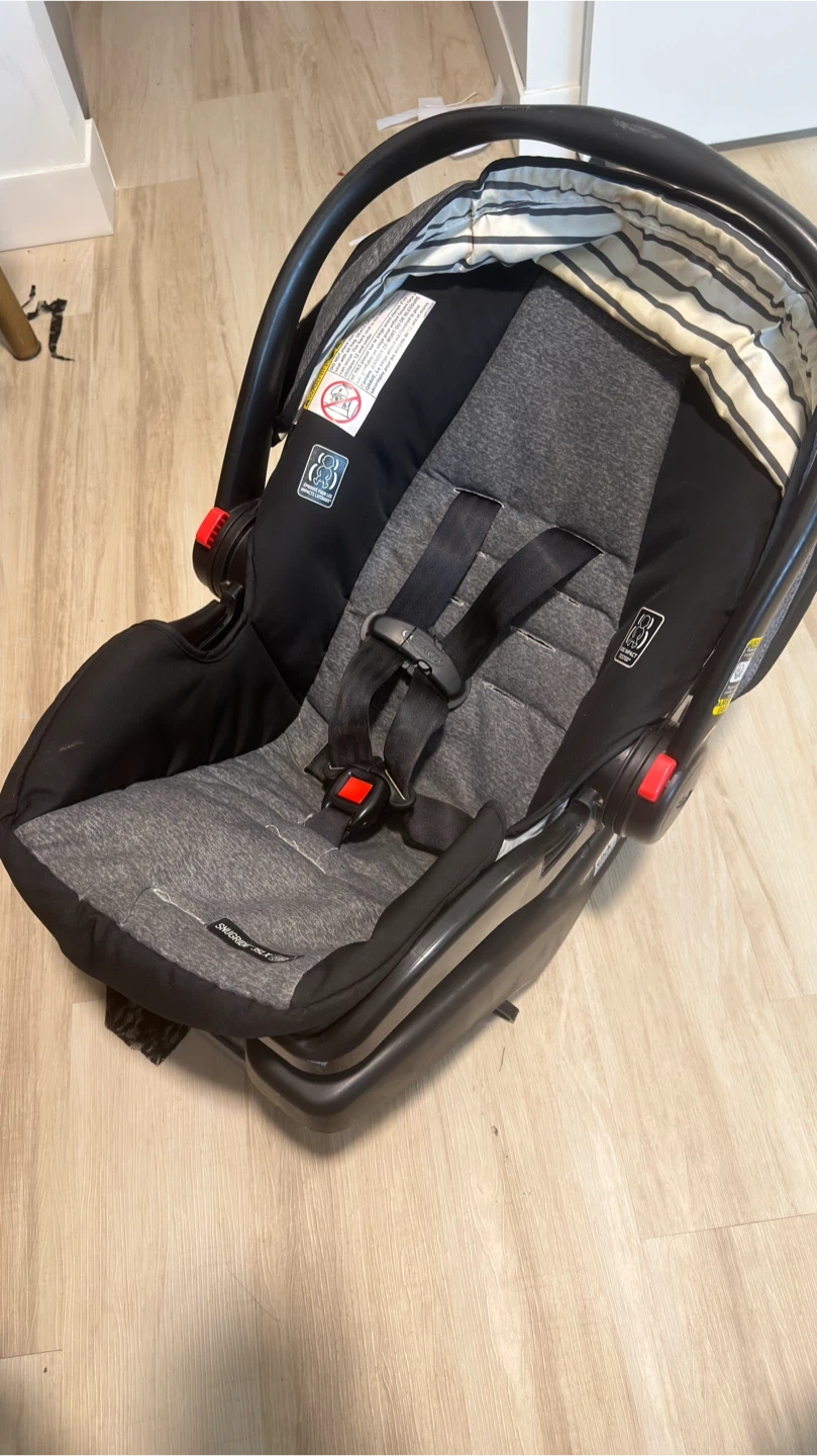 Graco infant car seat that comes with a LATCH base. It's a black and grey seat with striped canopy lining.