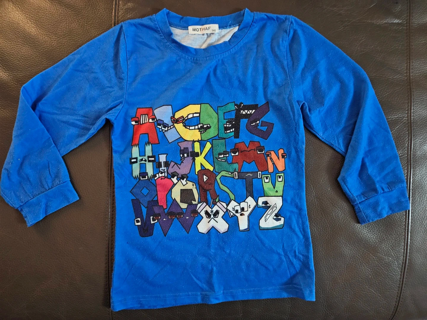 Blue long sleeve t-shirt for kids featuring a colorful alphabet design on the front. Made from a soft fabric blend. It's great for casual wear!