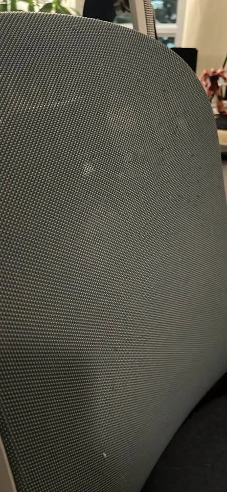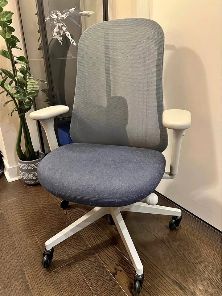 Features adjustable lumbar support, height adjustable arms, and fixed seat depth.