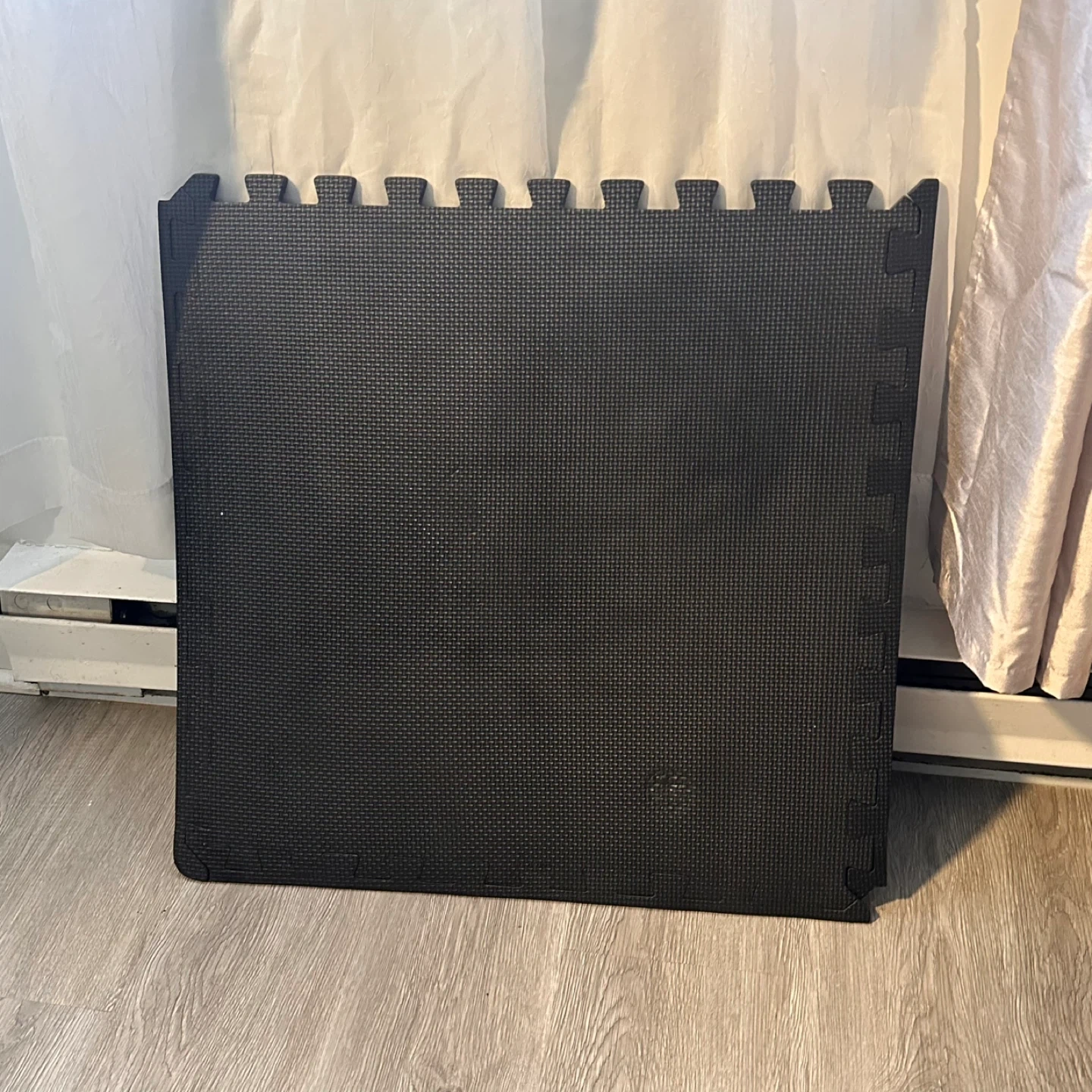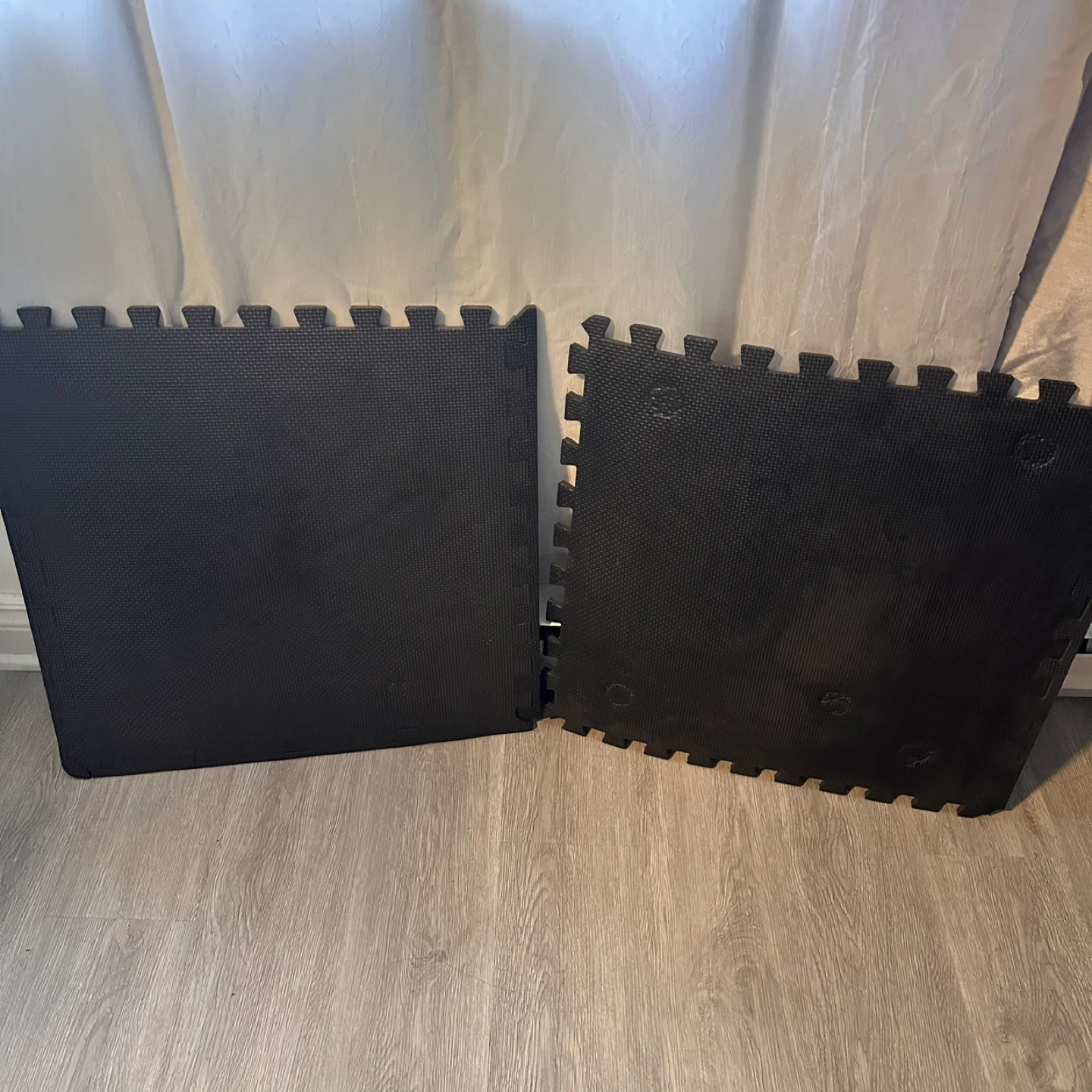 Two interlocking foam floor mats. Black colour. They connect easily to create a larger cushioned surface. Foam material.