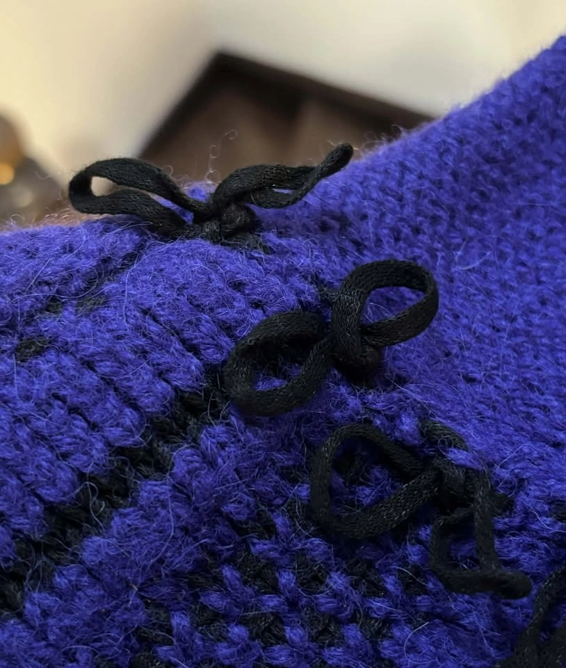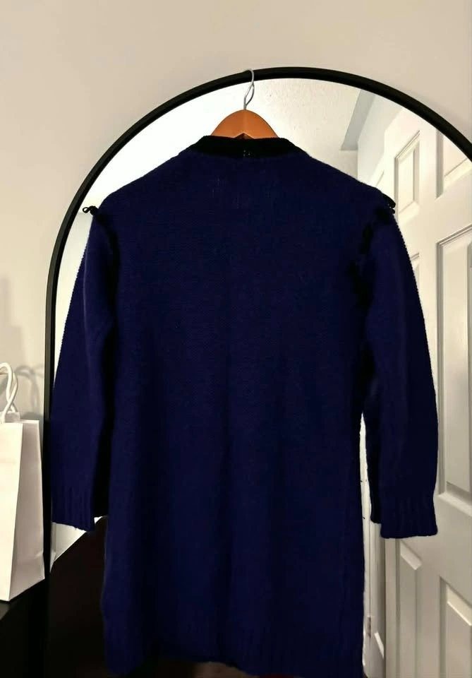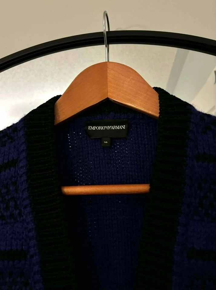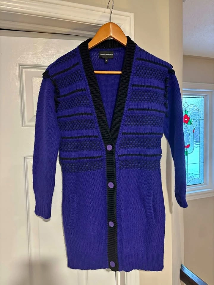 This piece dates to the late 1990s–early 2000s, a standout era of Armani design known for sculptural silhouettes and elevated knitwear. Genuine Emporio Armani woven label with eagle logo. Size 36 (women’s XS / slim S – true vintage fit). Longline, tailored silhouette. Custom Armani-engraved purple buttons. Decorative corset-style lacing at the shoulders. Multi-texture knit panels with contrast ribbed trim. High-quality, substantial knit construction. This is a rare, collectible Armani piece, perfect for vintage designer collectors, Y2K styling, or anyone looking for a timeless statement cardigan.