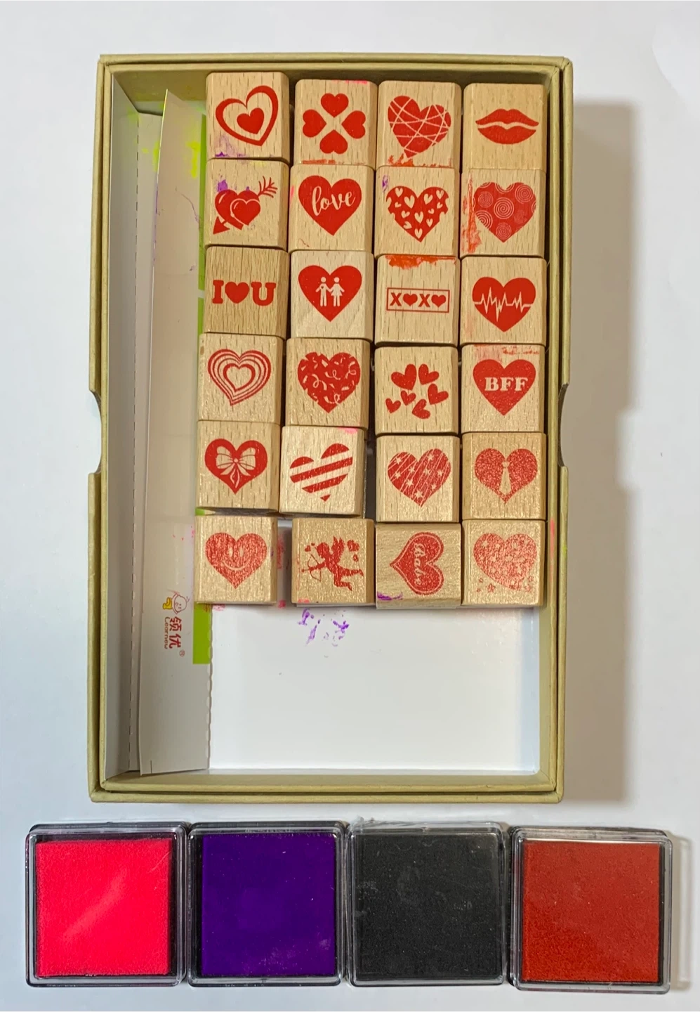 This set includes wooden stamps with floral designs and a separate wooden box of alphabet stamps. Also includes four ink pads in assorted colours with the valentine stamp set. Great for scrapbooking and card making!