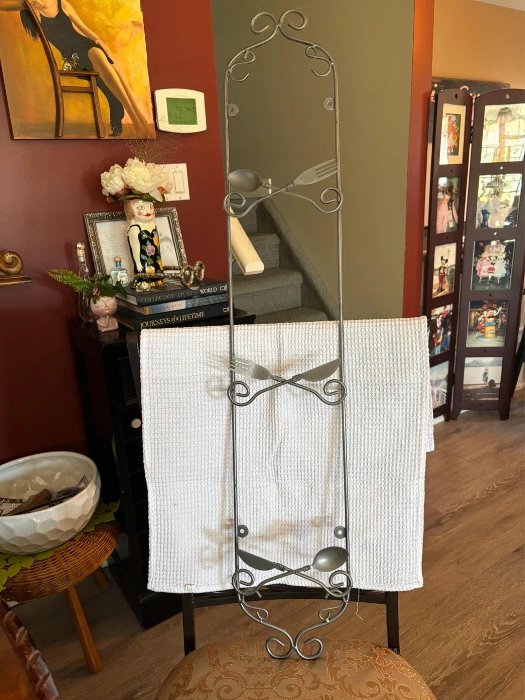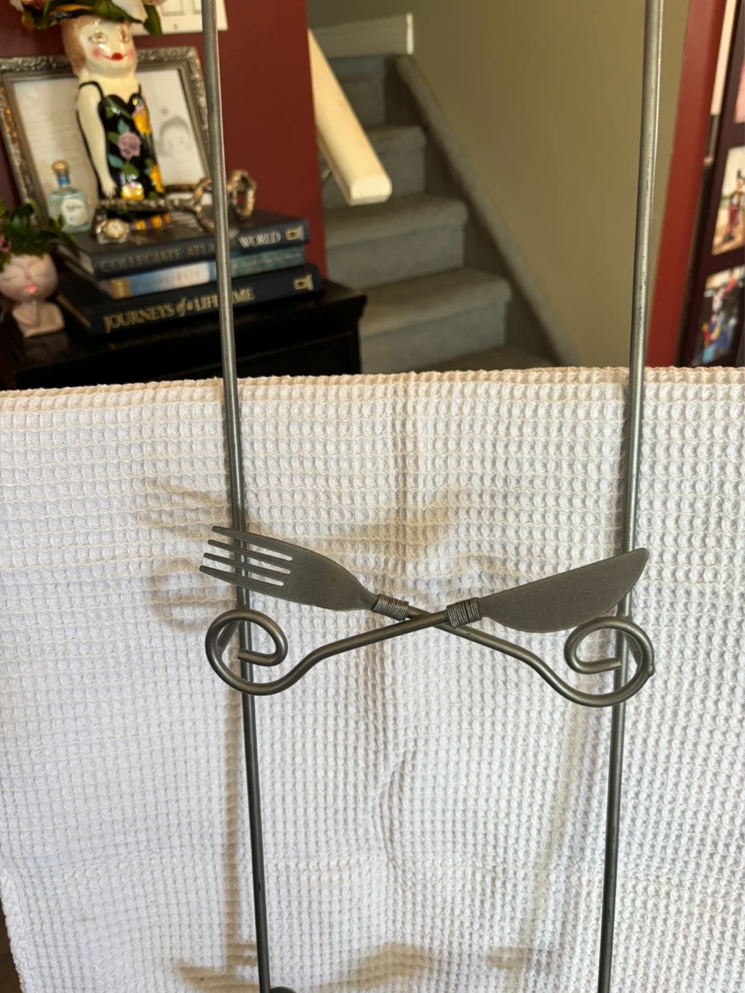 A decorative metal wall sconce designed to hold plates . It features ornate scrollwork and crossed utensil accents. This piece adds a charming touch to a kitchen or dining area.