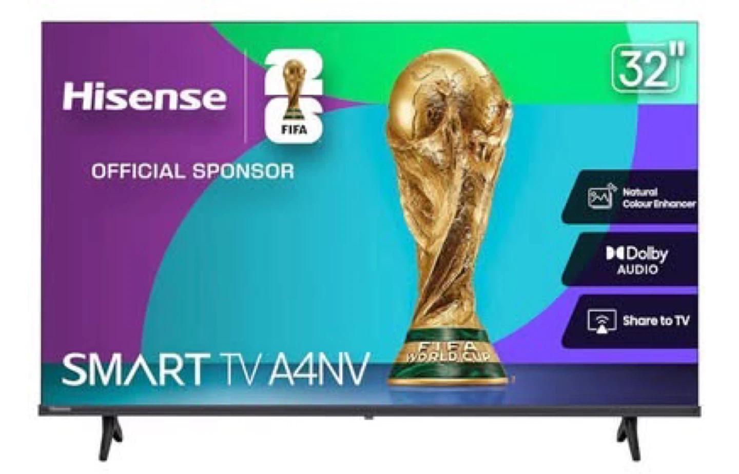 Hisense 32 inch Smart TV A4NV. Features Natural Colour Enhancer and Dolby Audio. Share to TV functionality included.