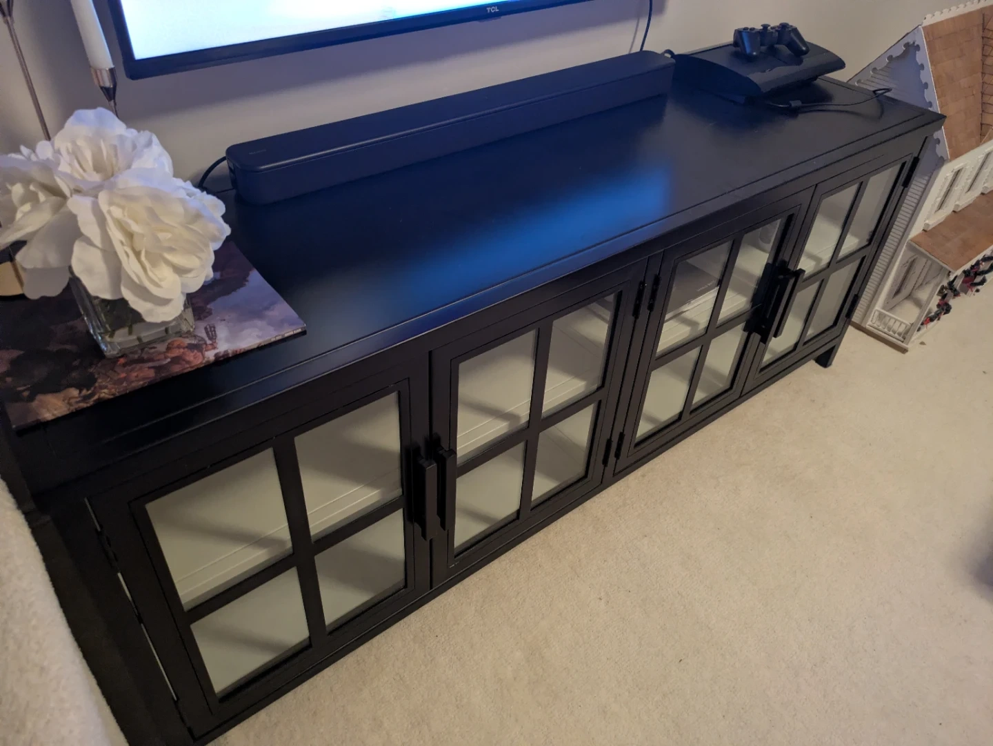 This black media console features four glass-front doors with interior shelving. It offers ample storage space for media components and decor. The console's design complements various living room styles.