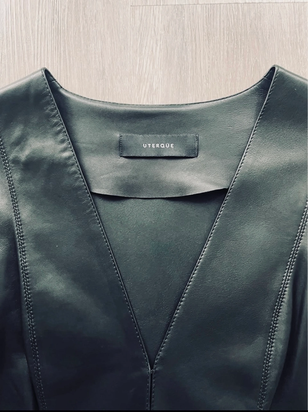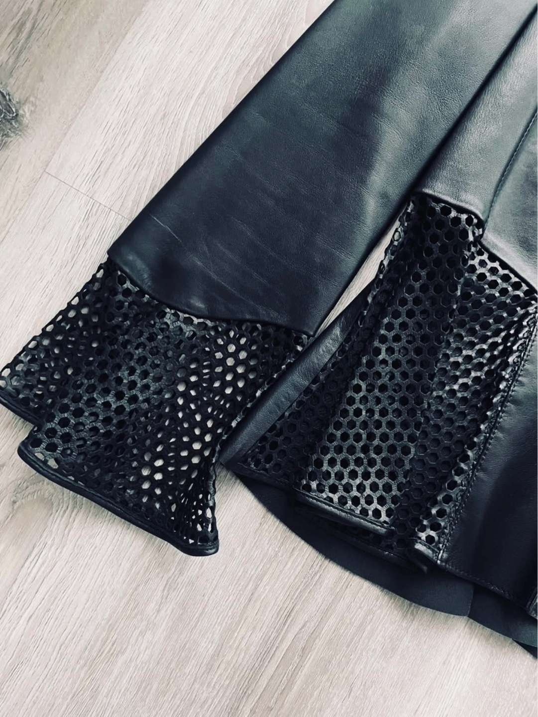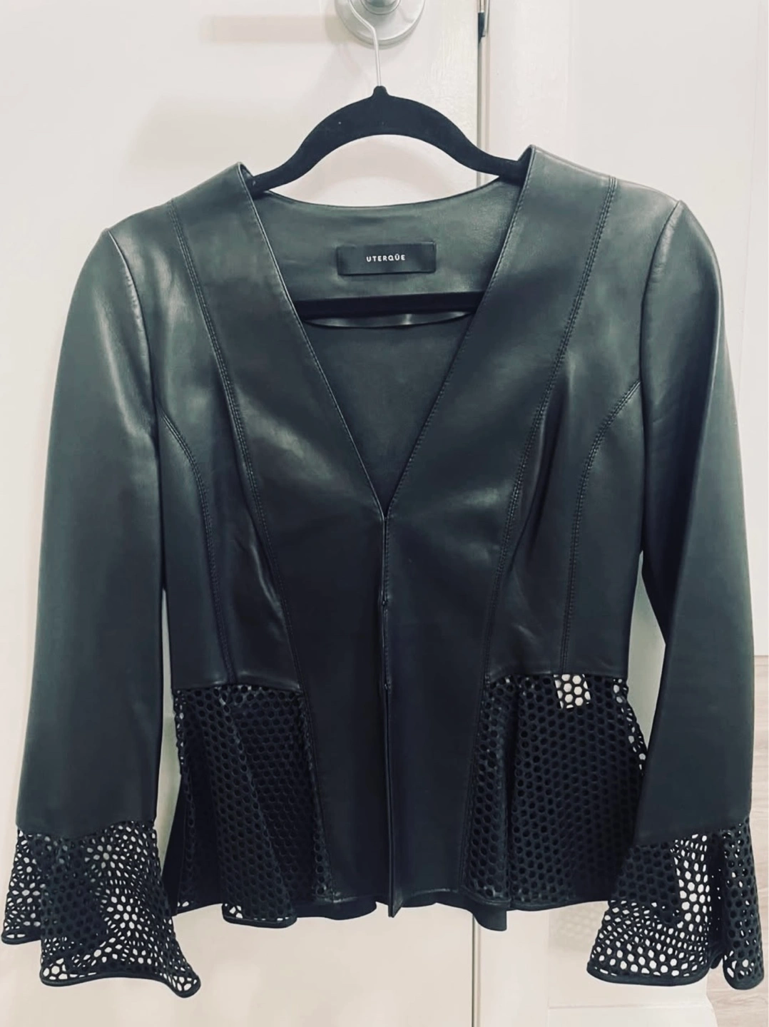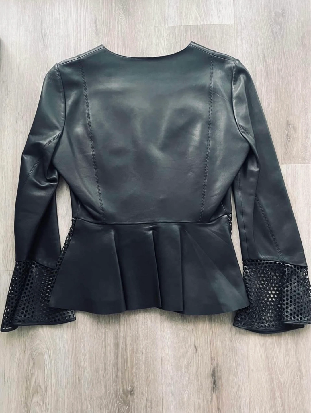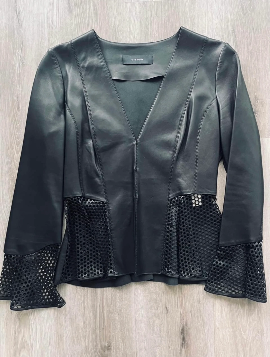 44Stunning black leather jacket from Spanish brand Uterqüe, made from 100% sheep leather. Features a V-neck, long sleeves, and a peplum waist. Mesh detailing on the sleeves and peplum. Close-fitting silhouette. Chic and stylish. Only worn a few times and still in mint condition.