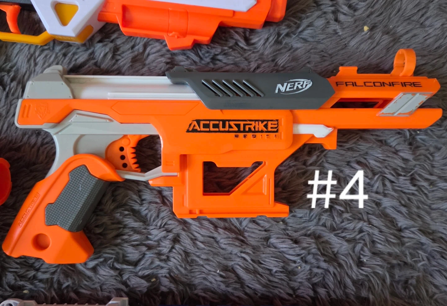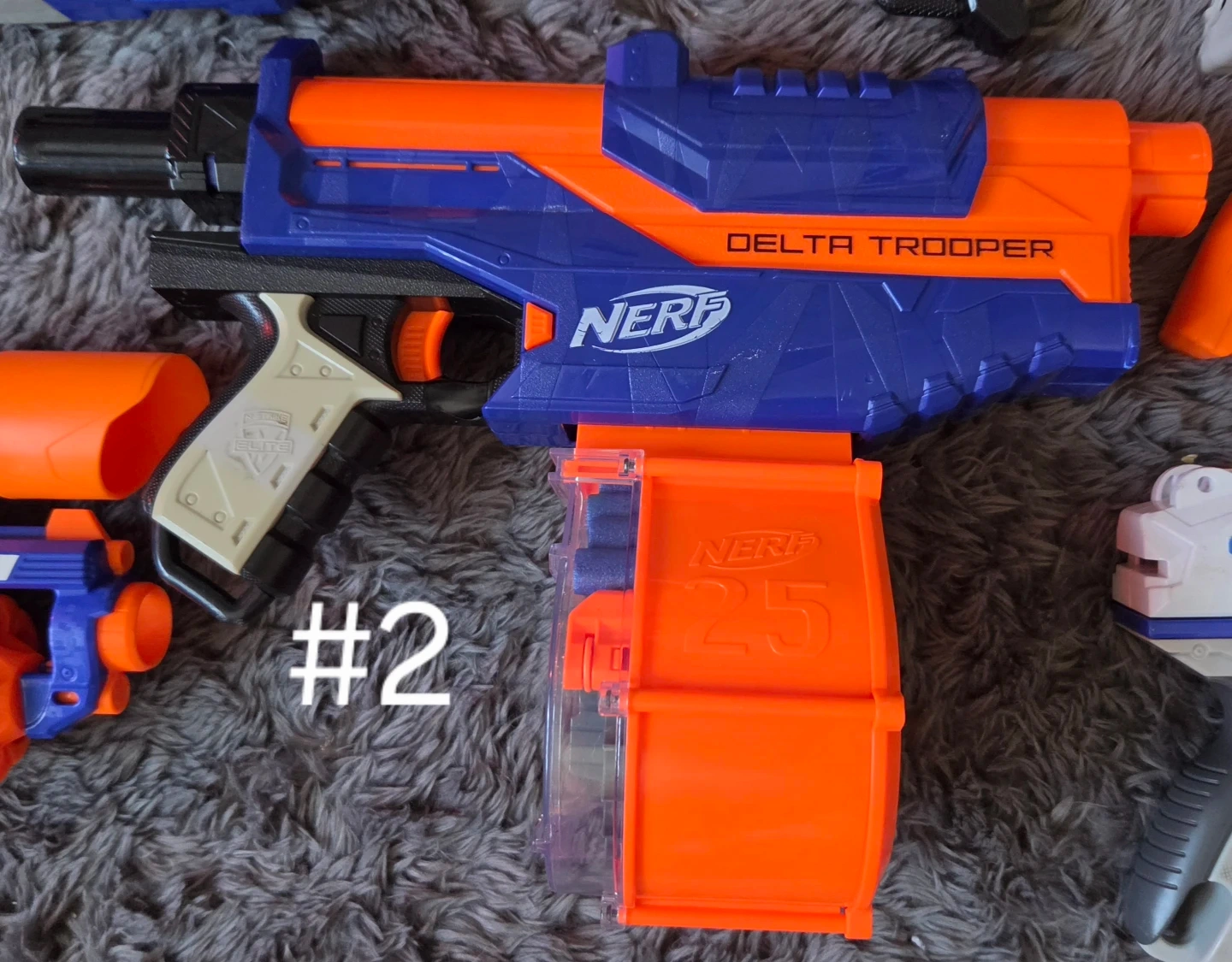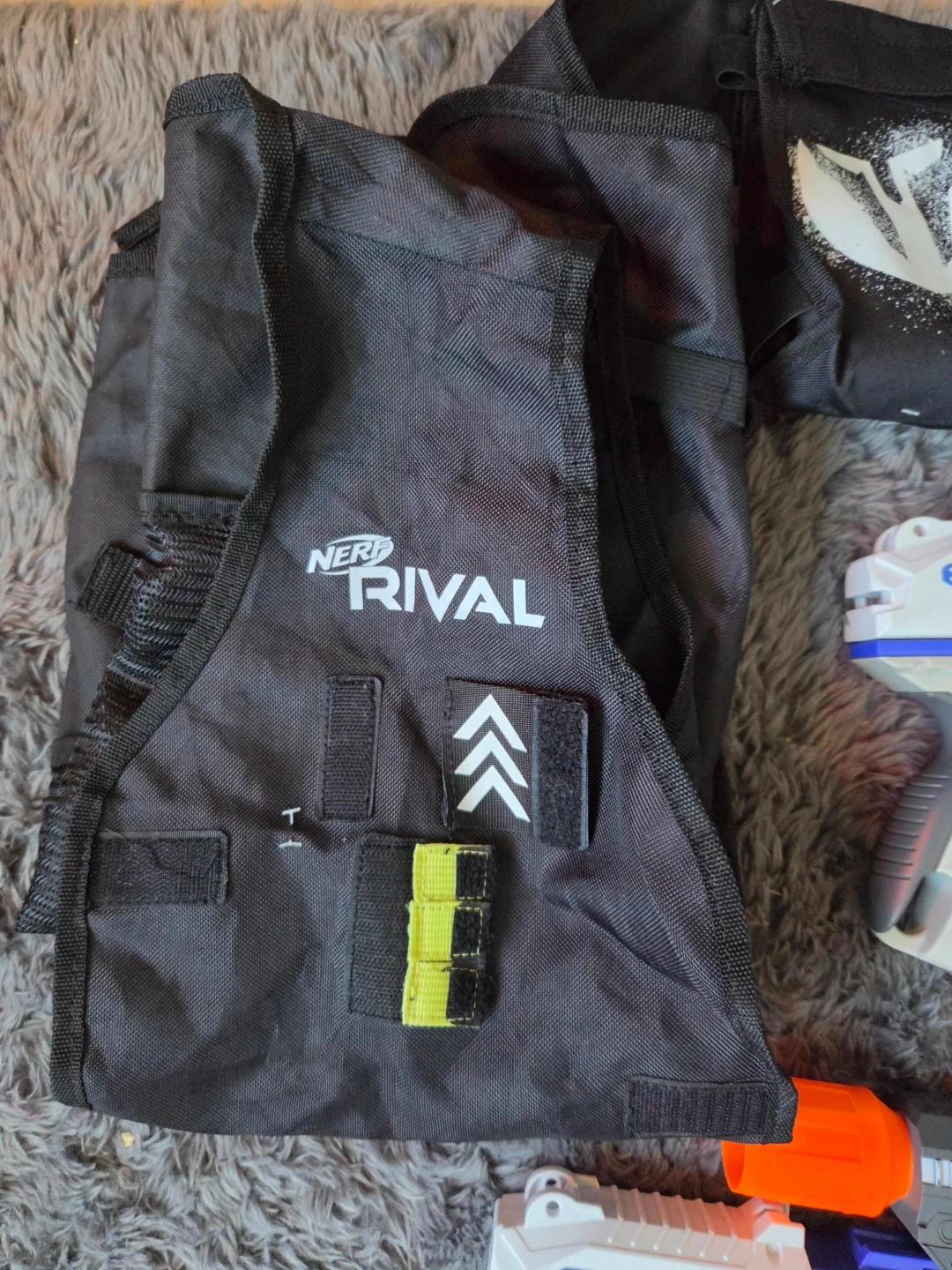 A collection of 6 nerf guns, as well as loads of bullets, 2 Nerf rivals bullet bags, and a N.R tactical vest. You can also ask for a magazine for bullets to hold them all.