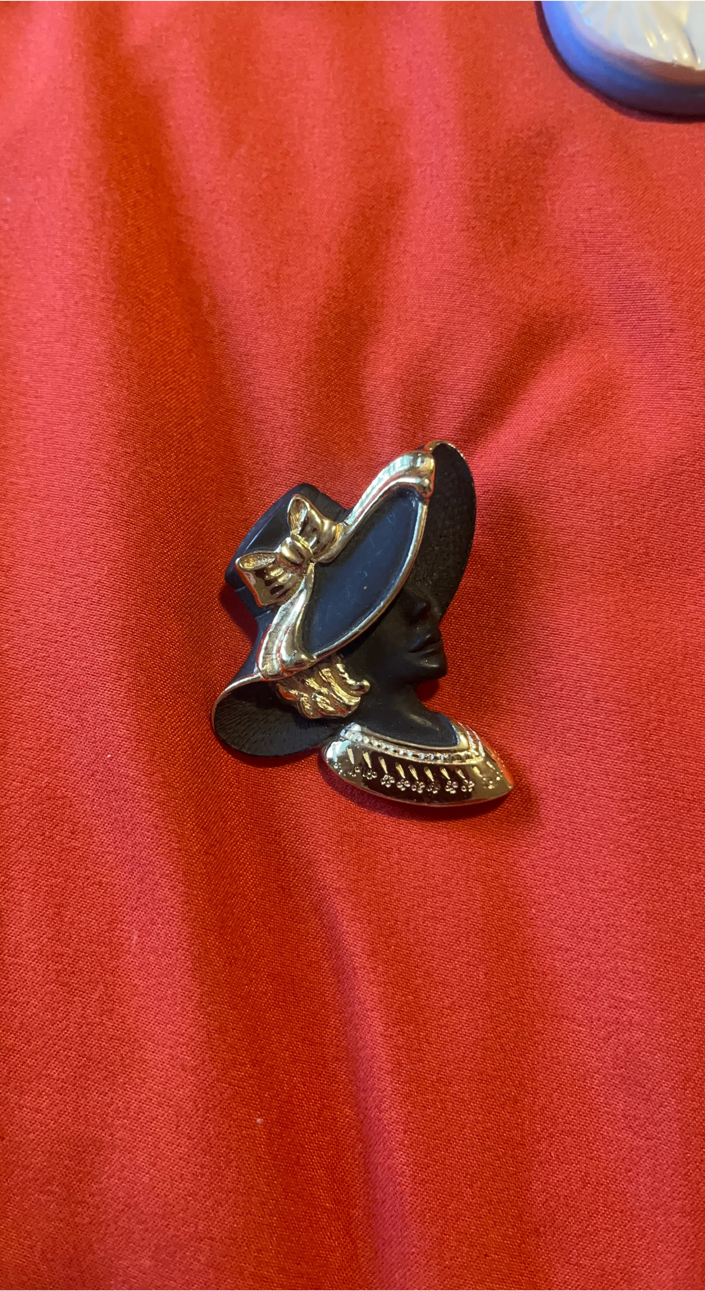 This vintage brooch features a silhouette of a lady wearing a hat. It's made of a dark material with gold-tone accents. The back has a pin closure for easy attachment.