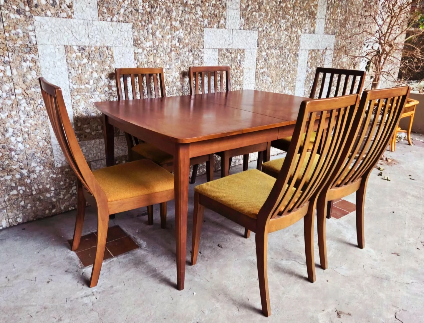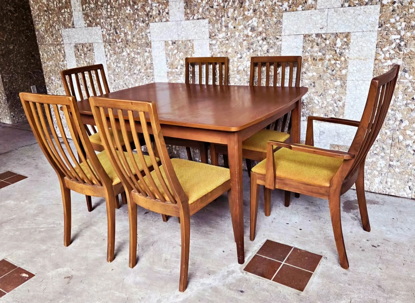Tags: retro vintage antique 1940s 1950s 1960s 1970s mcm mid century modern furniture solid wood walnut teak cinnamon dining set gold yellow moss extendable expendable convertible westendtrends furniture vanvaluevintage film local canada set dec settee