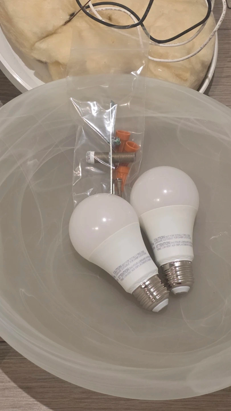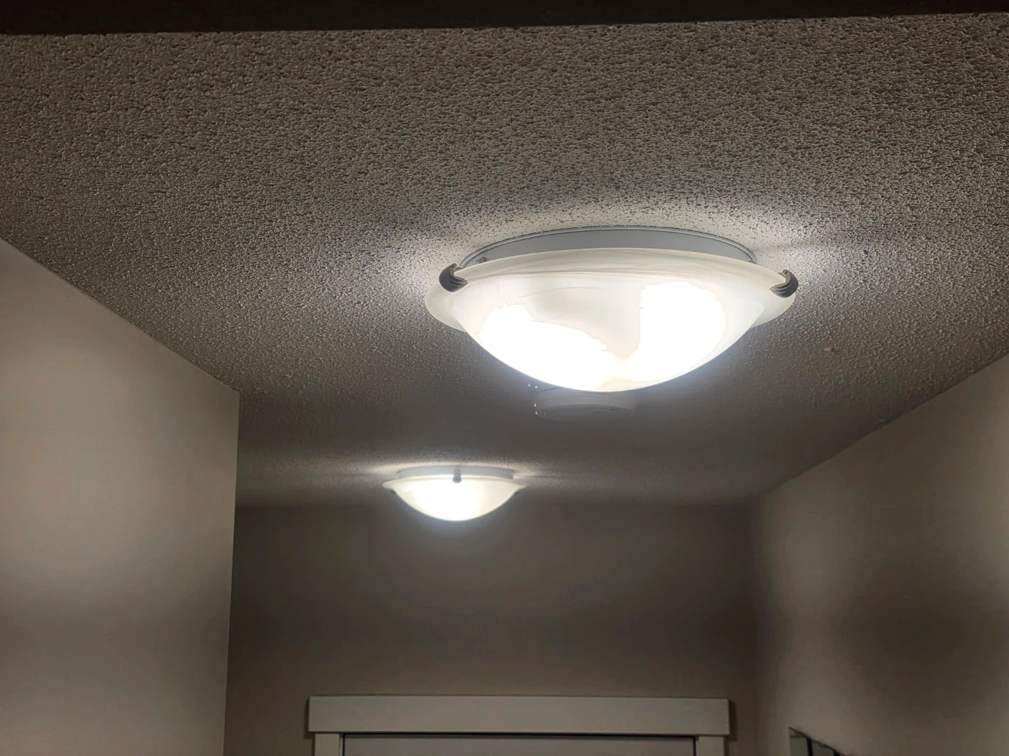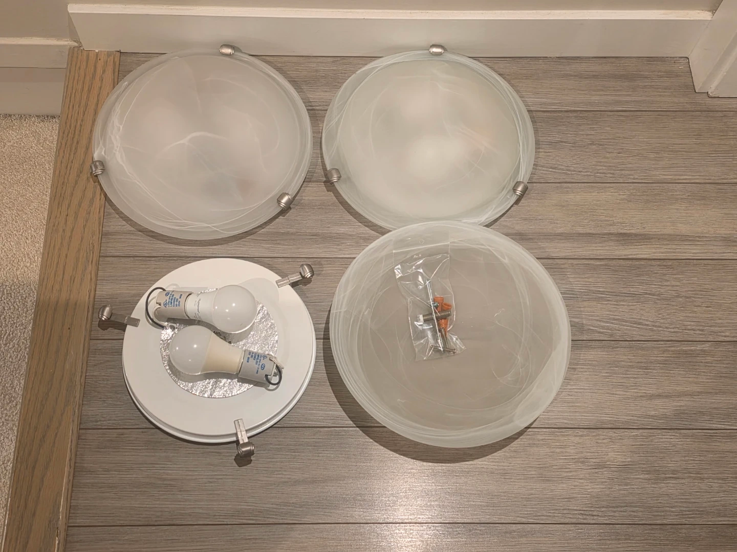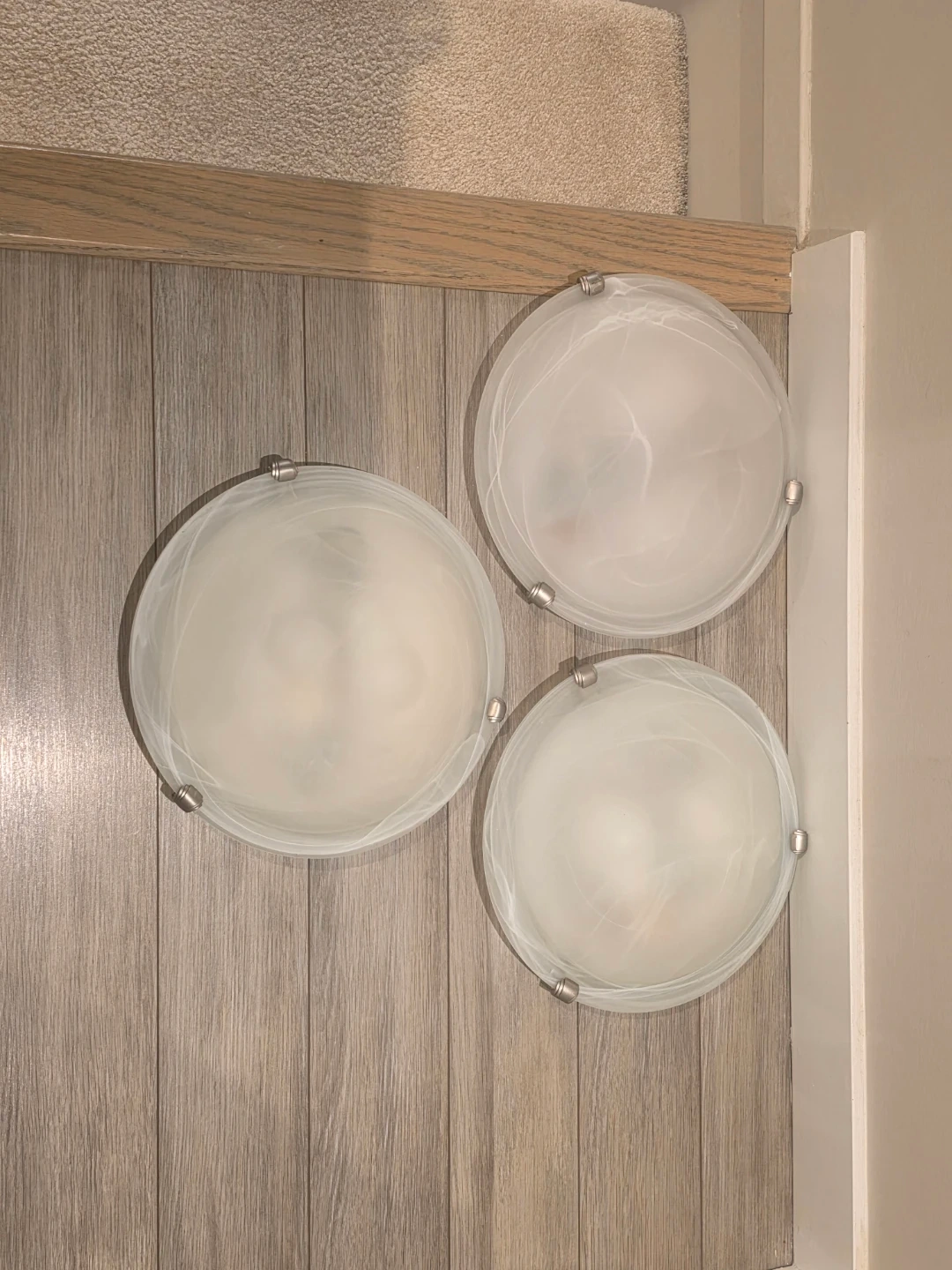 Selling a set of three frosted glass flush mount ceiling light fixtures. These lights have a swirl pattern in the glass and come with LED bulbs. Includes hardware for installation.