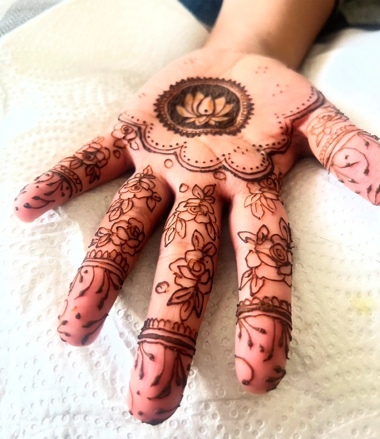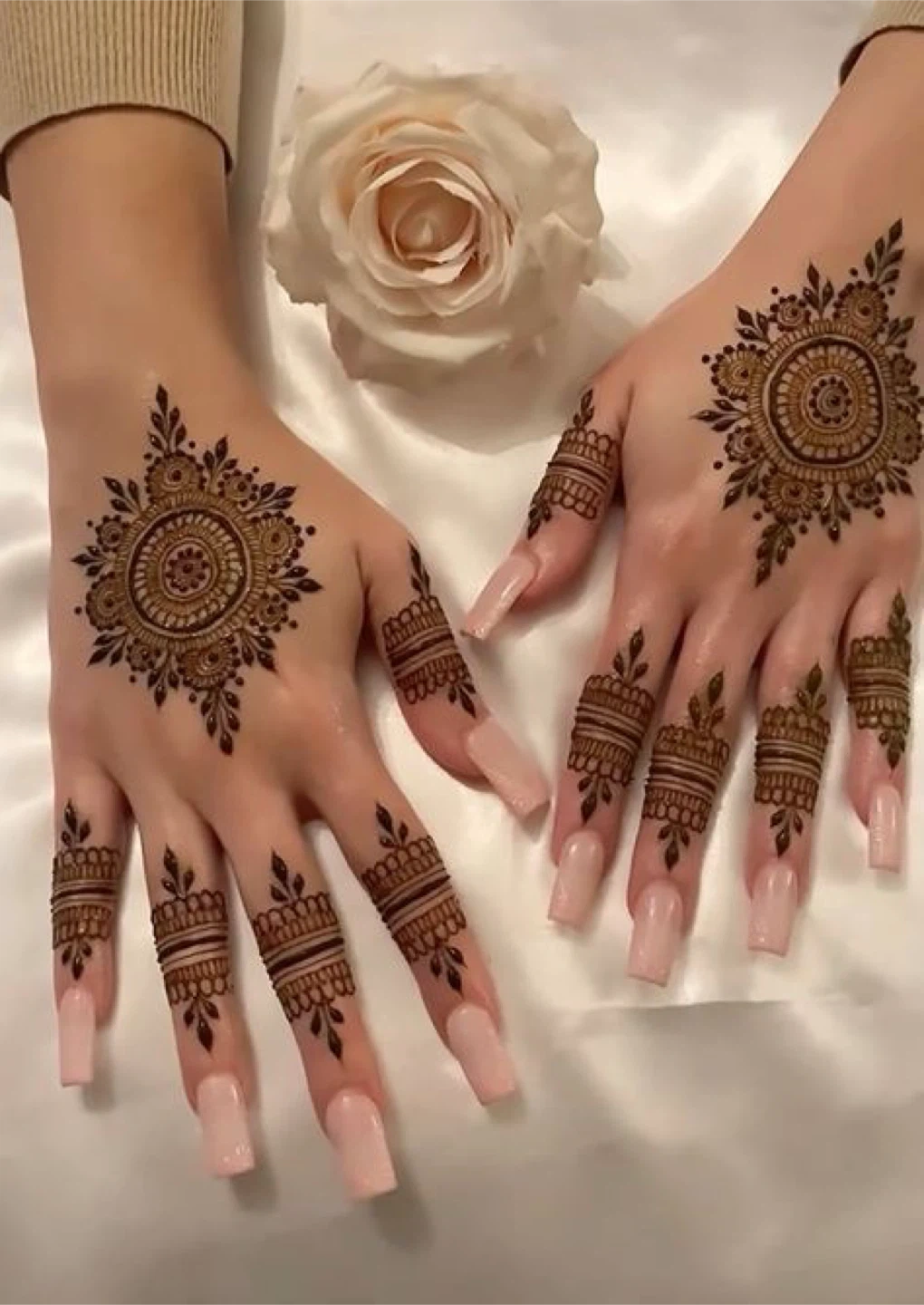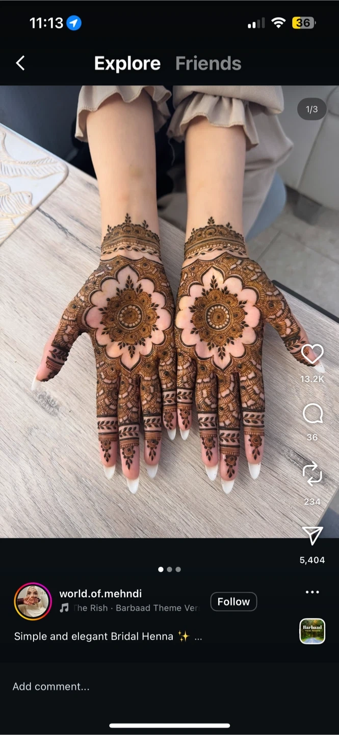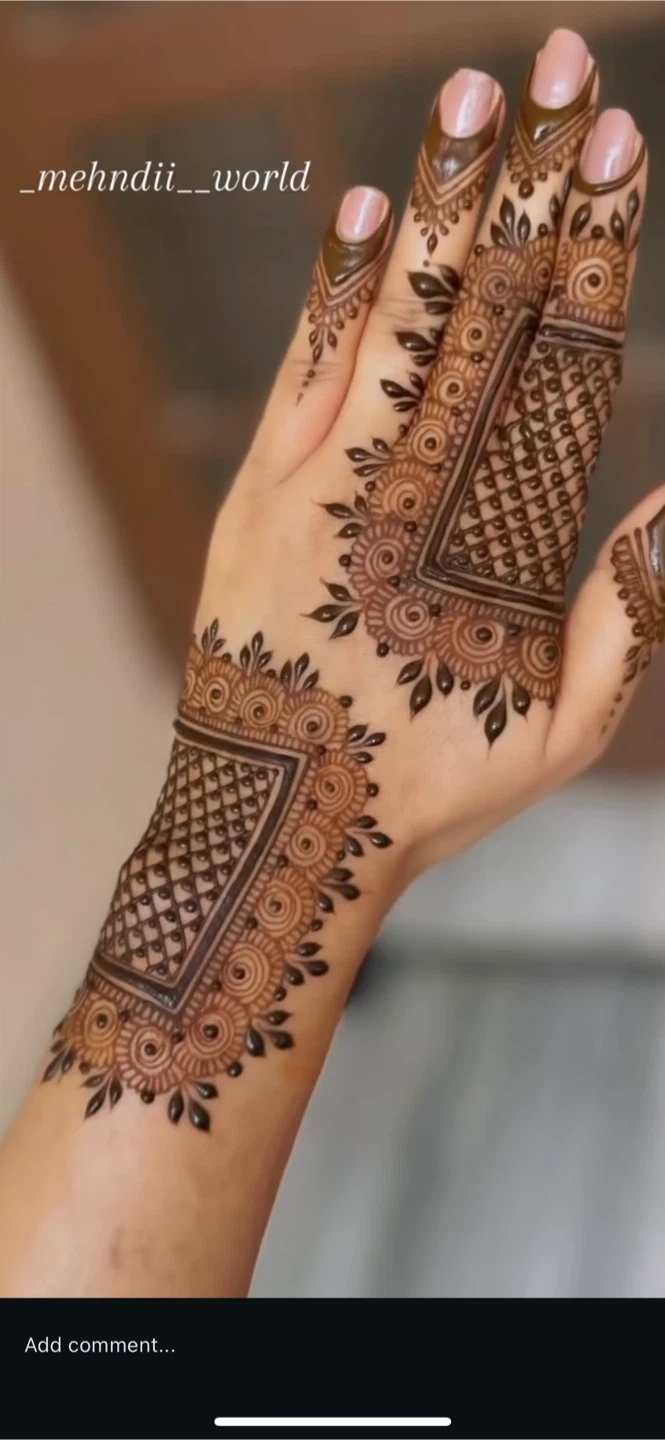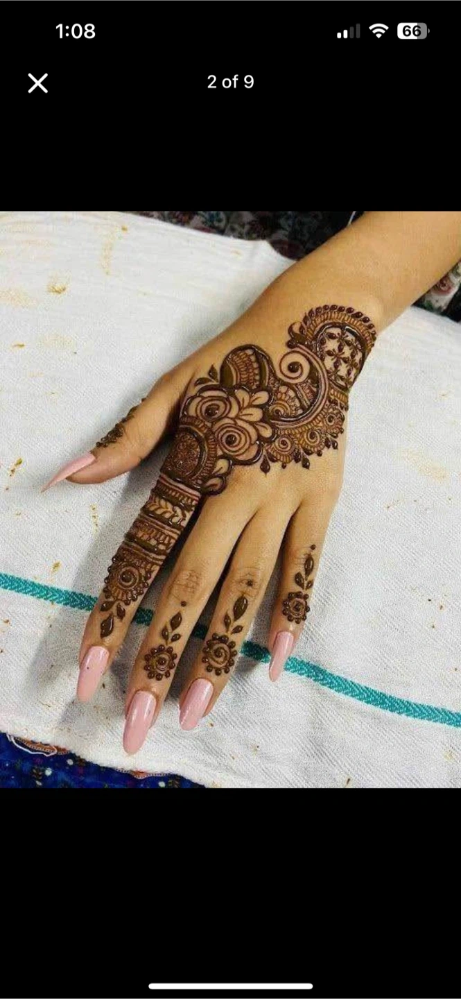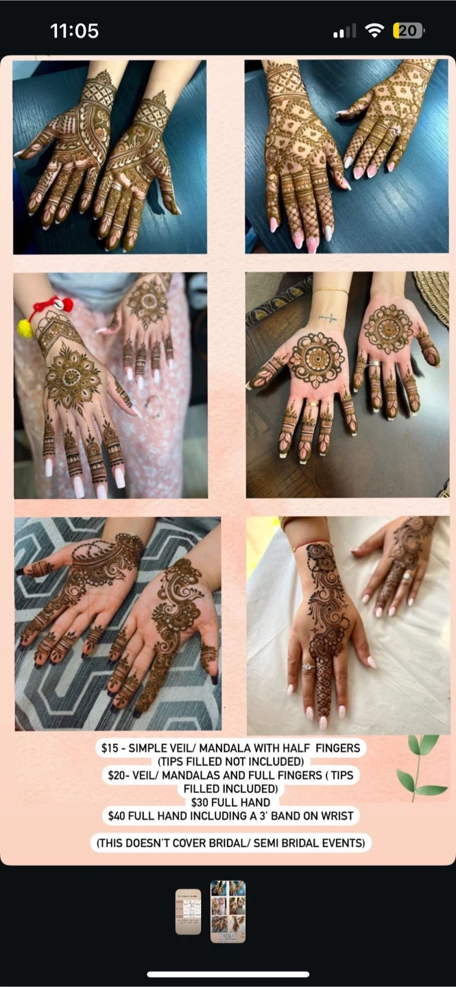 Beautiful EID henna designs applied to hands. Options include simple mandala with half fingers for $15 per side, full hands with tips for $20, four sides 60$. These designs are great for events and celebrations!