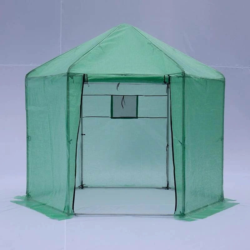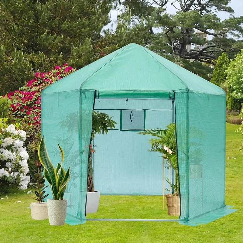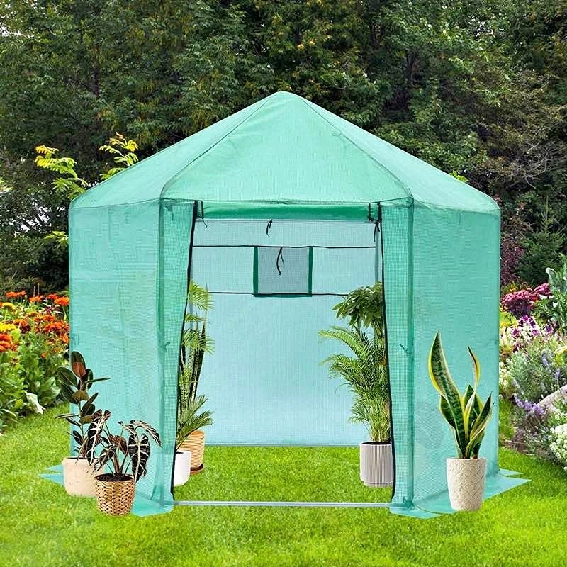 Brand new in box walk-in hexagonal greenhouse with a reinforced metal frame and durable waterproof cover. Features zippered roll-up door, UV protection, and strong insulation—perfect for extending your growing season.