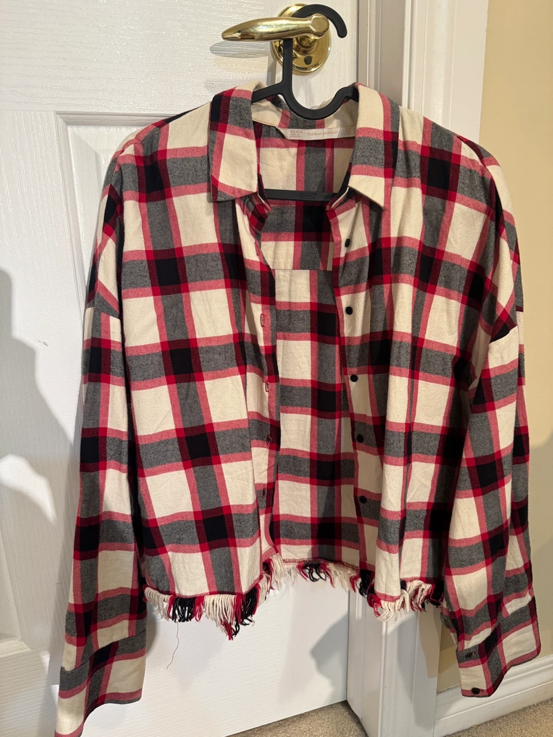 Selling a Zara Trafaluc Collection flannel women’s shirt in size medium. It features a red, black, and cream plaid pattern. It has a frayed hem for a stylish, casual look