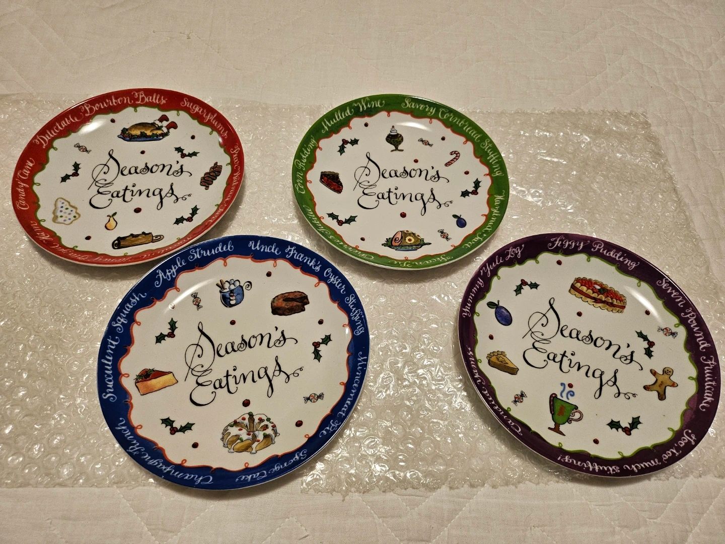 I have a set of four "Seasons Eatings" plates to give away. Each plate features festive holiday food illustrations and lettering around the rims. They come in their original box, tied with a red ribbon. Perfect for adding a touch of holiday cheer to your table or to give as a gift!