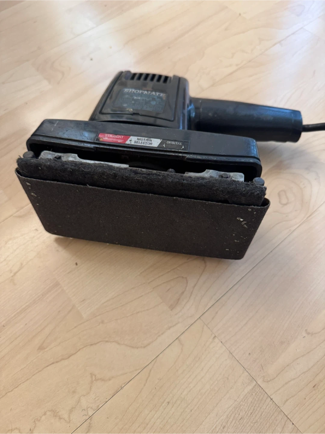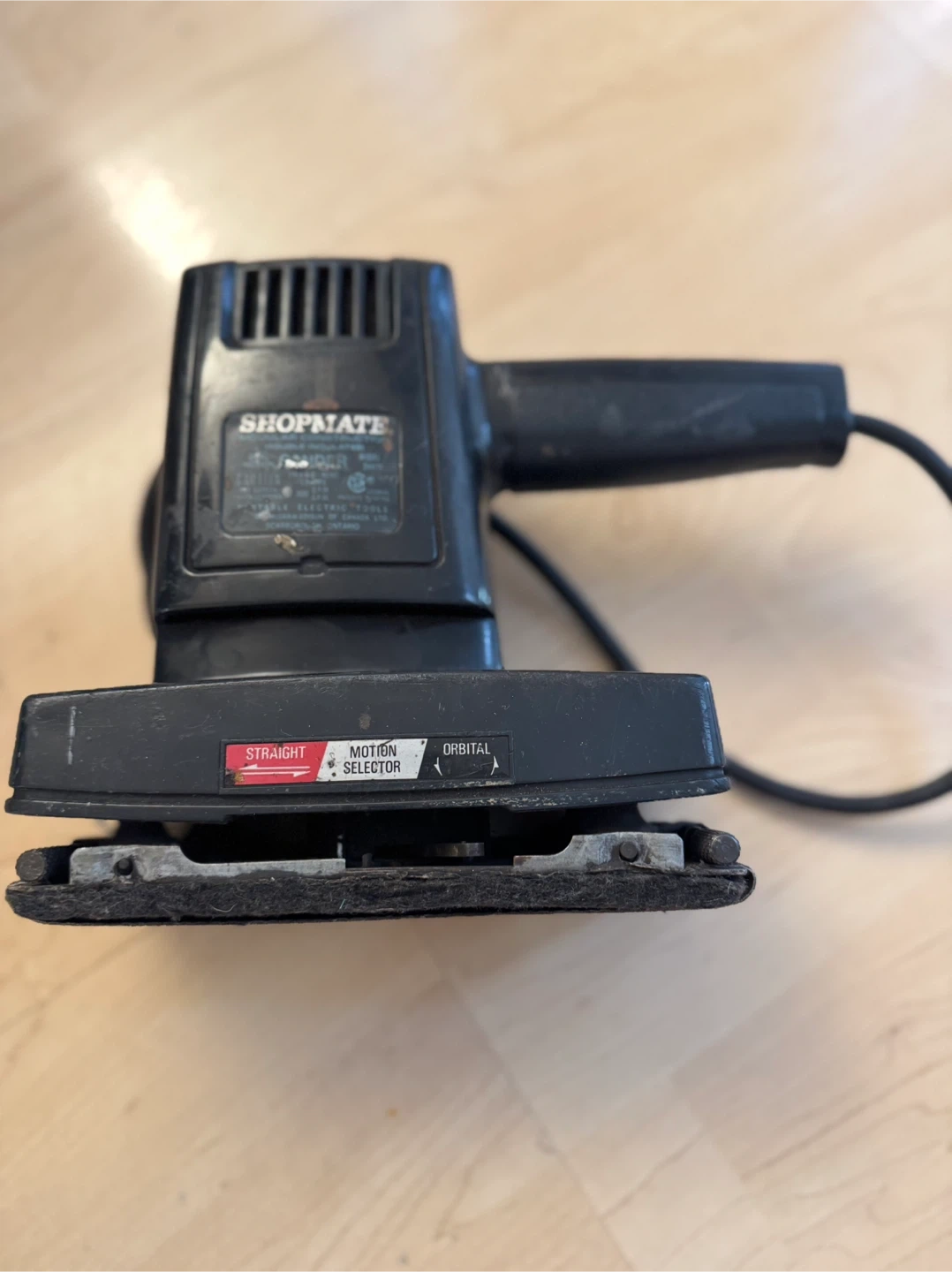 This is a Shopmate sander with a motion selector for straight or orbital action. It's ideal for various sanding projects around the house. Corded operation for continuous power.