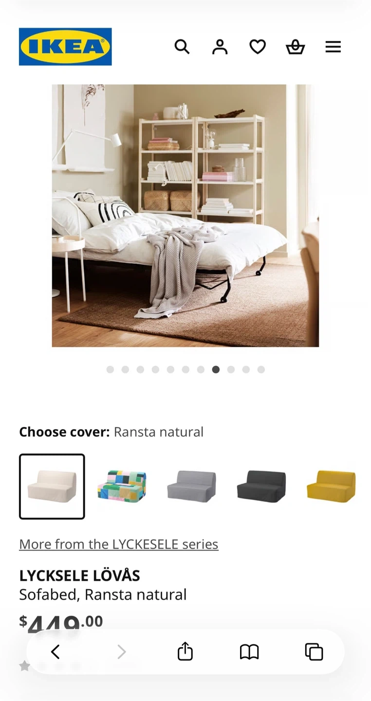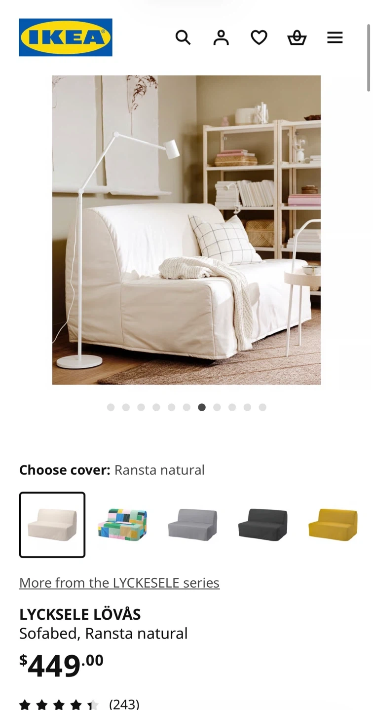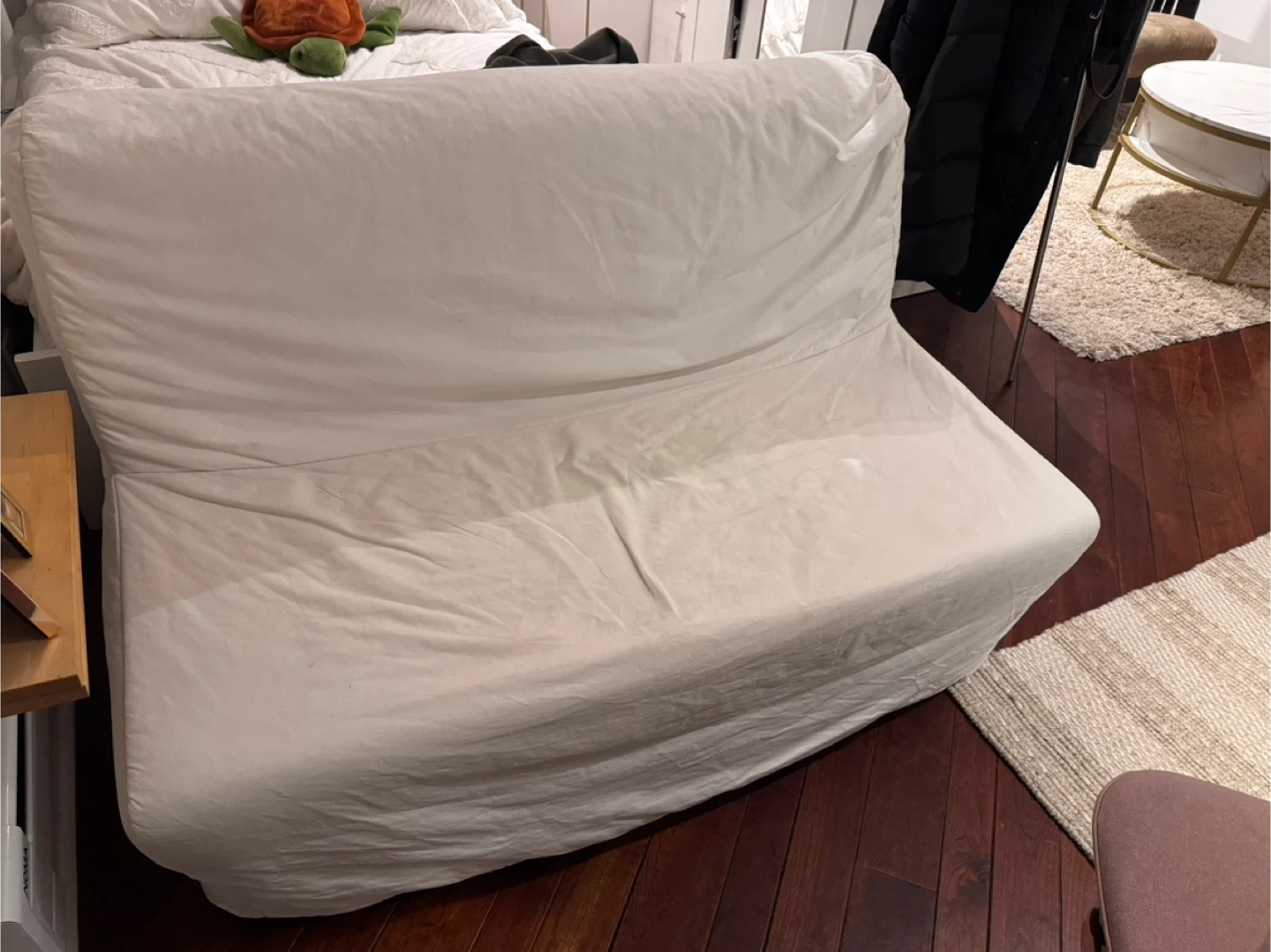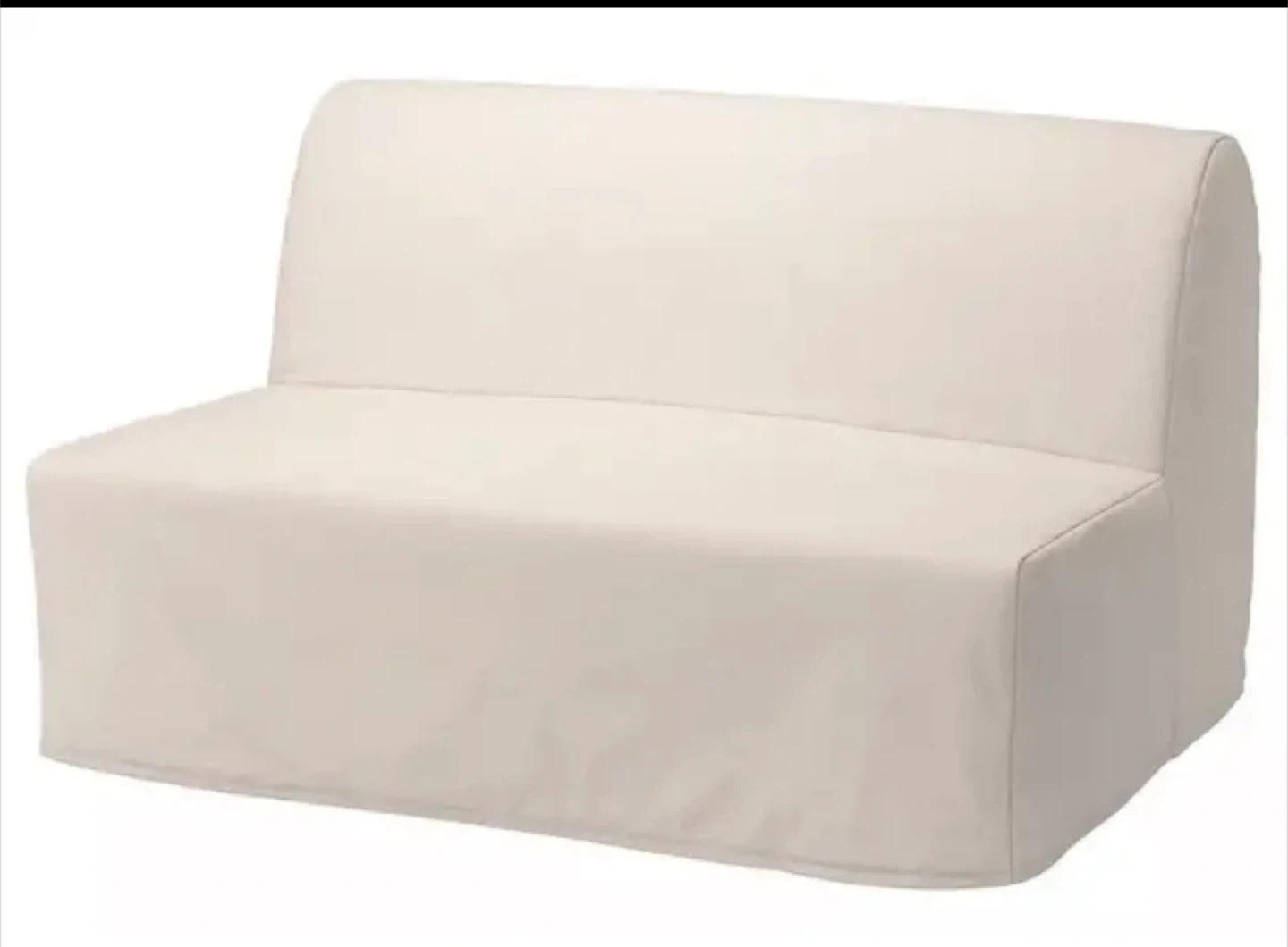 IKEA LYCKSELE LÖVÅS sofabed with a Ransta natural cover. It measures 142 cm wide and 100 cm deep when unfolded as a bed. This piece easily converts from a sofa to a bed, making it handy for guests!