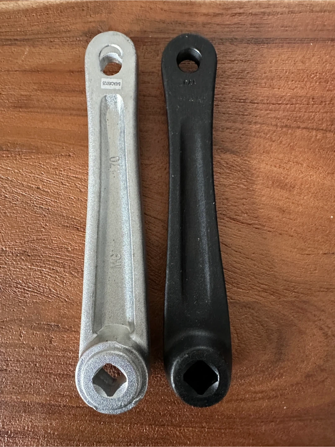 Includes one silver and one black bicycle crank arm. The silver crank arm has "BABAC#50125" and "70" stamped on it. The black crank arm has "70" stamped