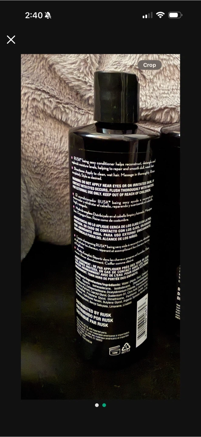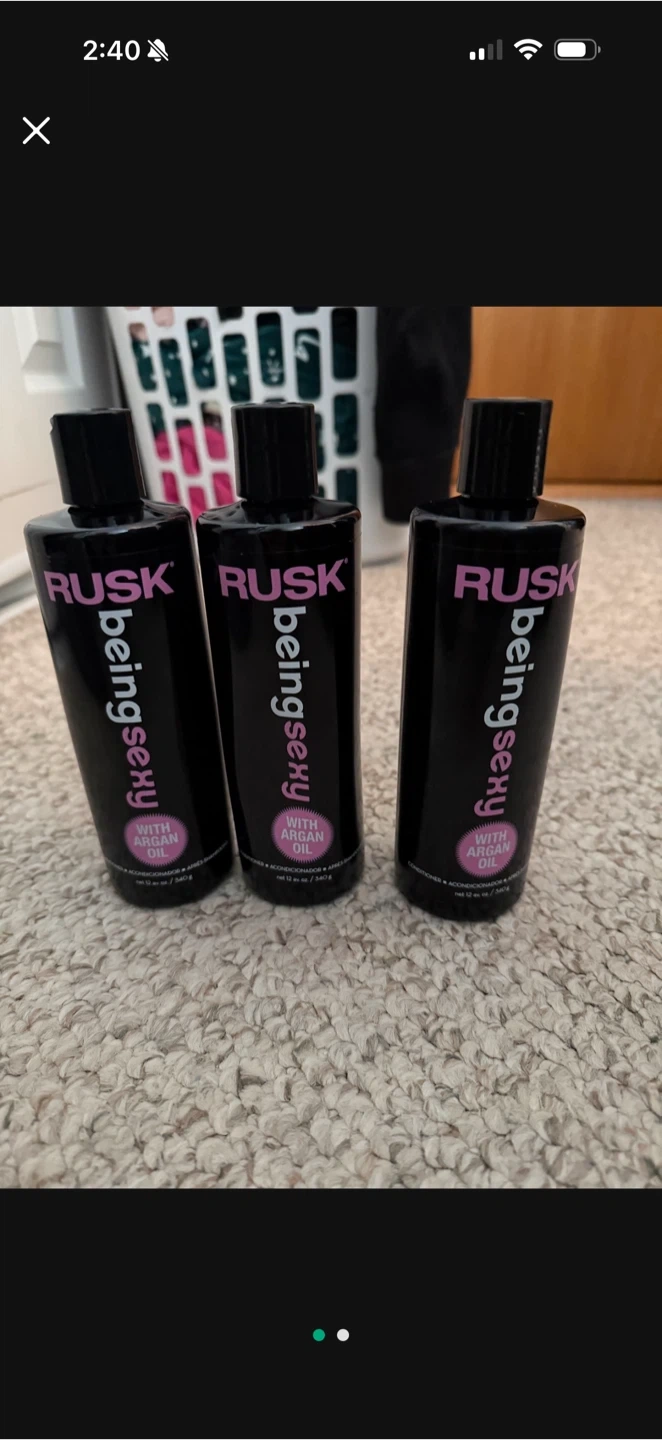 Set of three Rusk Being Sexy conditioner bottles. Each bottle contains 12 oz (340g) and is formulated with argan oil. Helps reconstruct, detangle, and smooth hair. Apply near eyes or on irritated skin with caution.