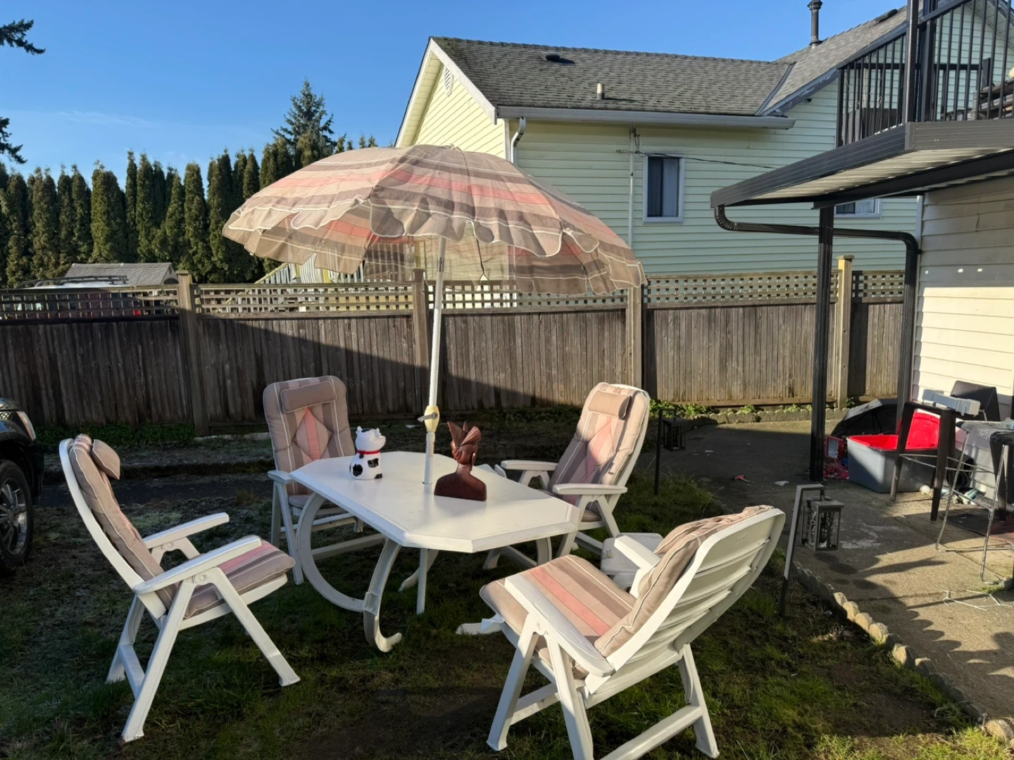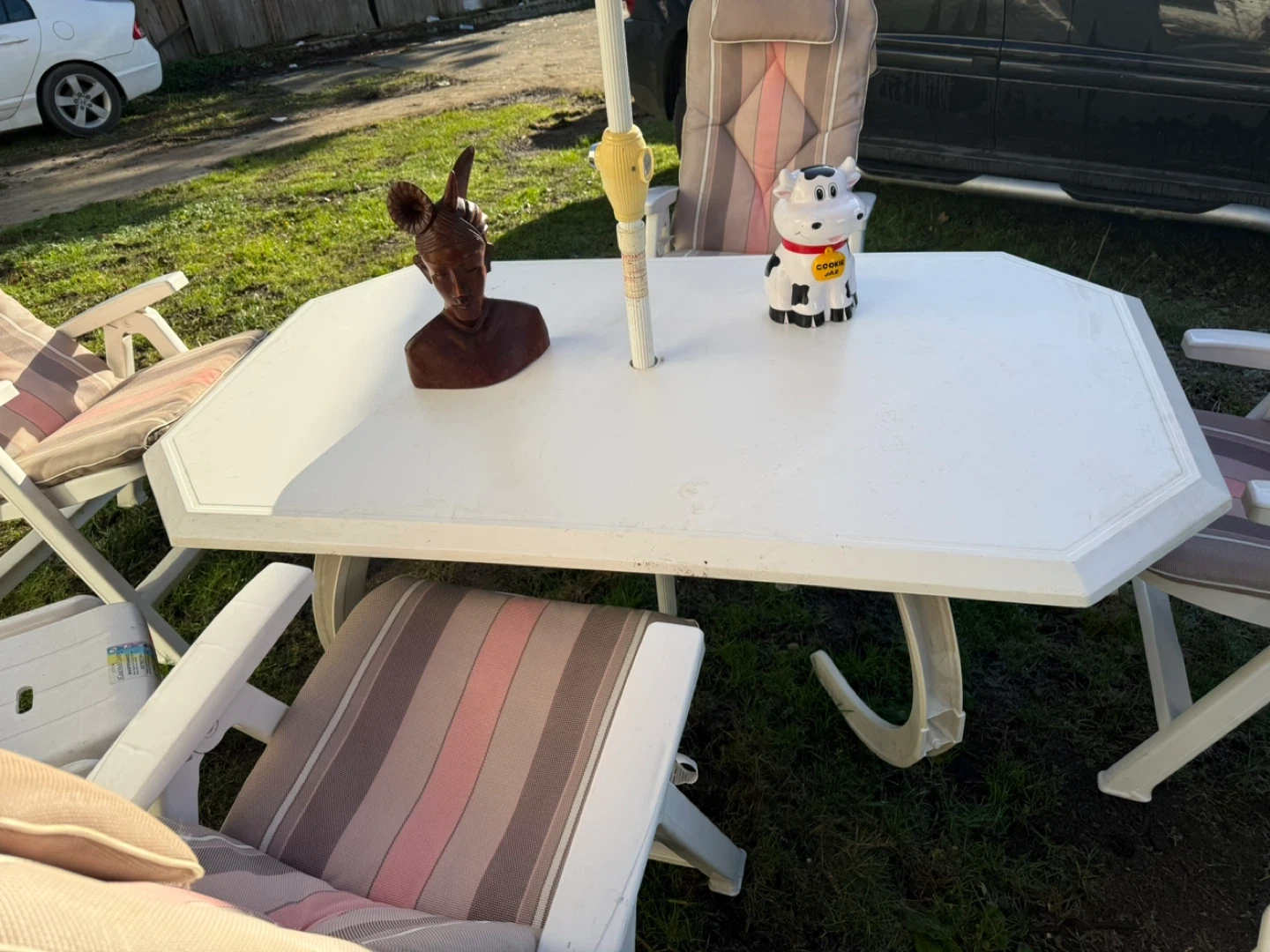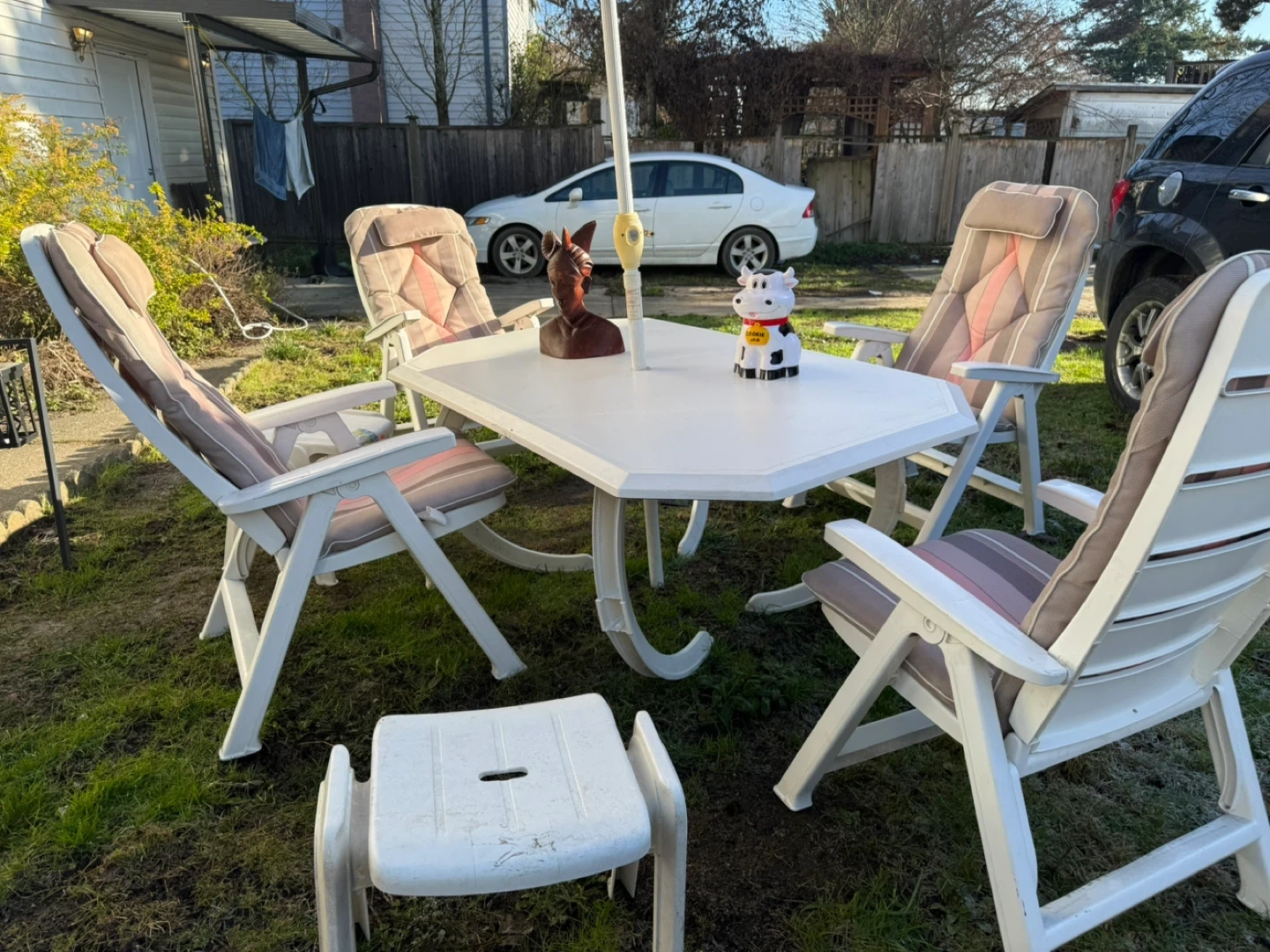 Selling a very good quality outdoor patio set. The chairs are hard, durable plastic (not cheap quality) and very sturdy.