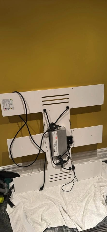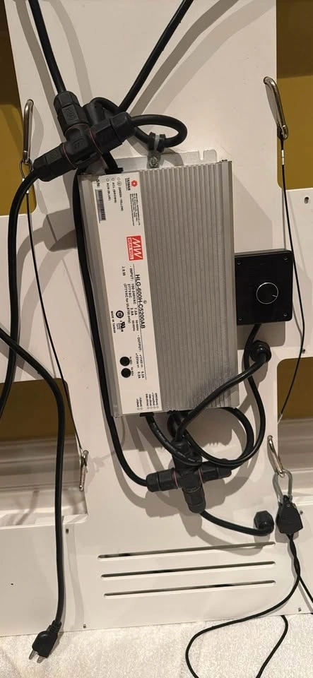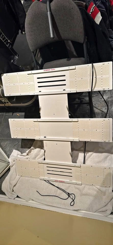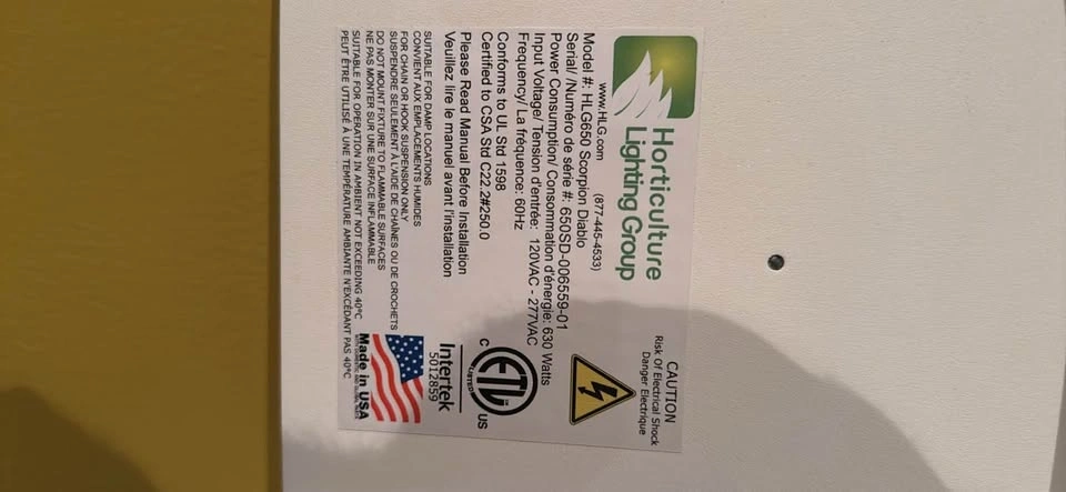 This is a high-performance LED grow light, the HLG Scorpion Diablo from Horticulture Lighting Group. It's designed for indoor cultivation, especially in spaces with low ceilings or vertical racks. It uses QB648 Diablo Quantum Boards for even light distribution. The full-spectrum output, including 660nm red light, is great for all plant growth stages. It's highly efficient at around 715W, meant to replace 1000W HID systems while using less power and generating less heat. Power Consumption: ~715 Watts. Flower Footprint: Up to 5' x 5'. Vegetative Footprint: Up to 6' x 6'. Efficacy: 2.88 µmol/J.