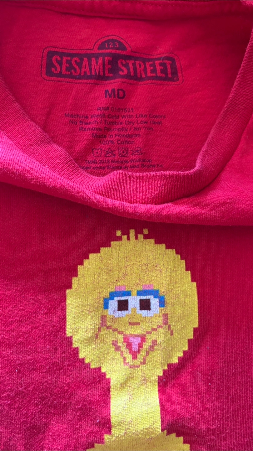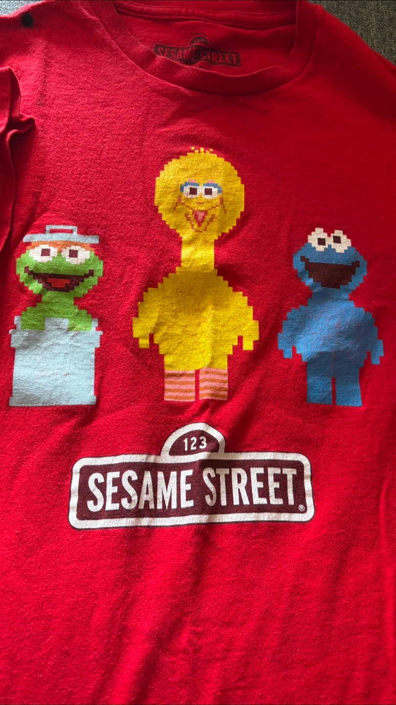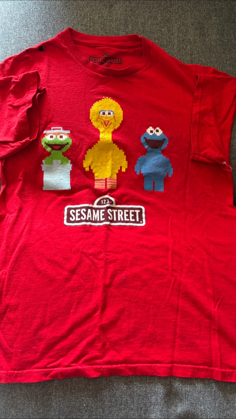 I'm selling a cute Sesame Street t-shirt in size medium! It's red and features pixelated versions of Big Bird, Oscar the Grouch, and Cookie Monster. There are a couple of small marks on the shirt, as shown in the photos.