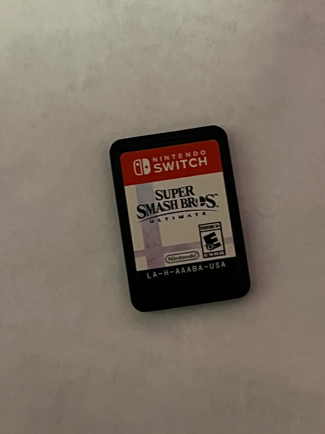 This is the Super Smash Bros. Ultimate game cartridge for Nintendo Switch. It's rated E for Everyone 10+ by ESRB. The cartridge code is LA-H-AAABA-USA.