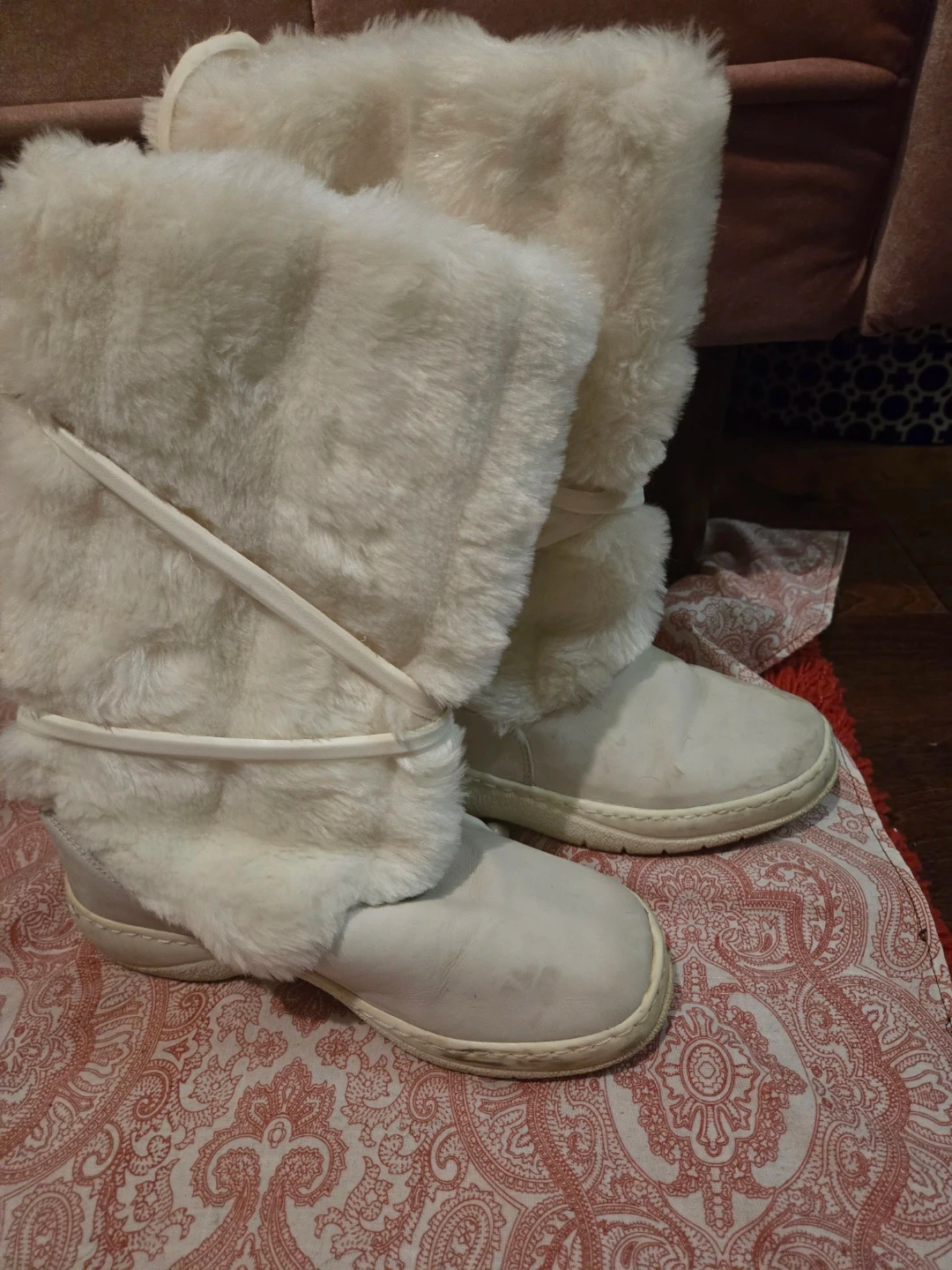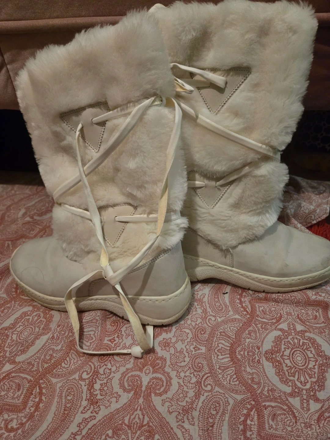 Warm winter boots featuring a white faux fur lining and cuff. They have a soft leather-like exterior with decorative lacing. Perfect for keeping your feet toasty during cold weather!